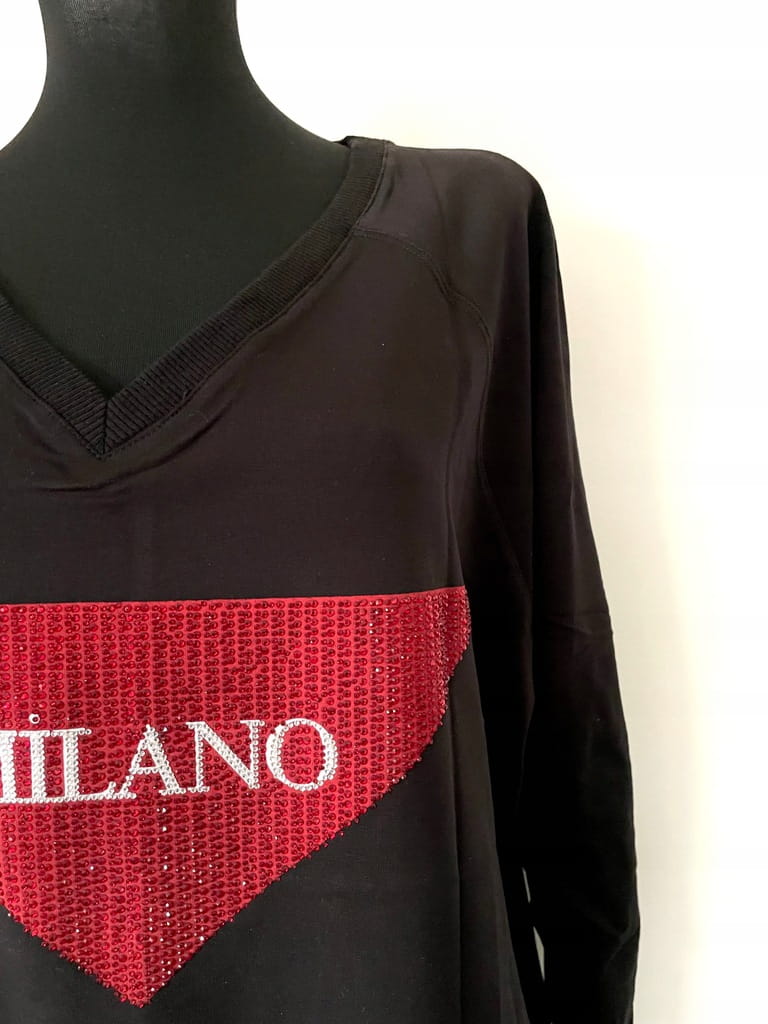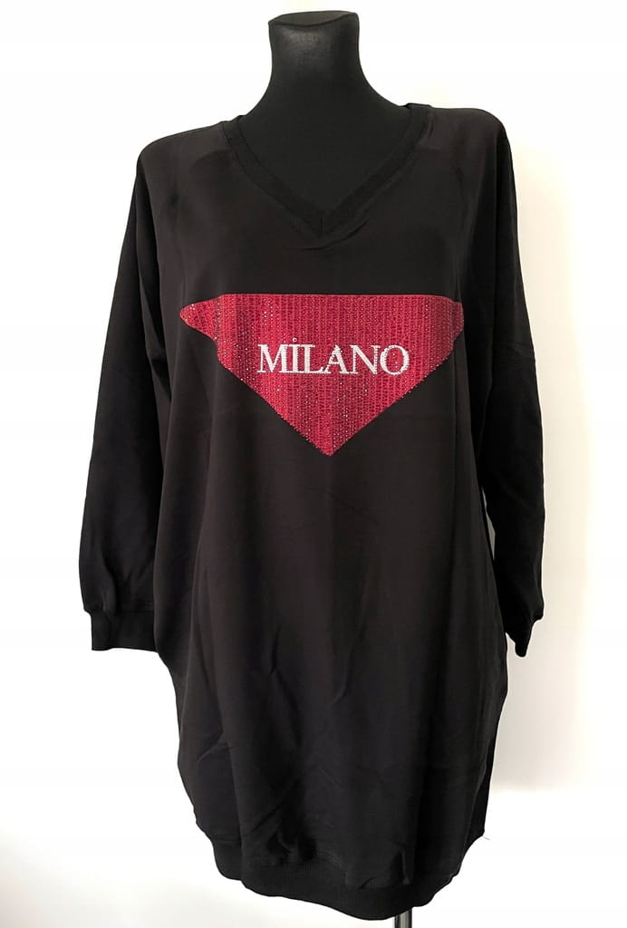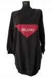 Długa czarna luźna damska bluza/ sukienka z czerwoną aplikacją z napisem "Milano" z kryształkami, z kieszeniami i długim rękawem - r. uniwersalny