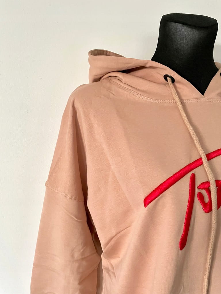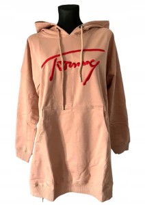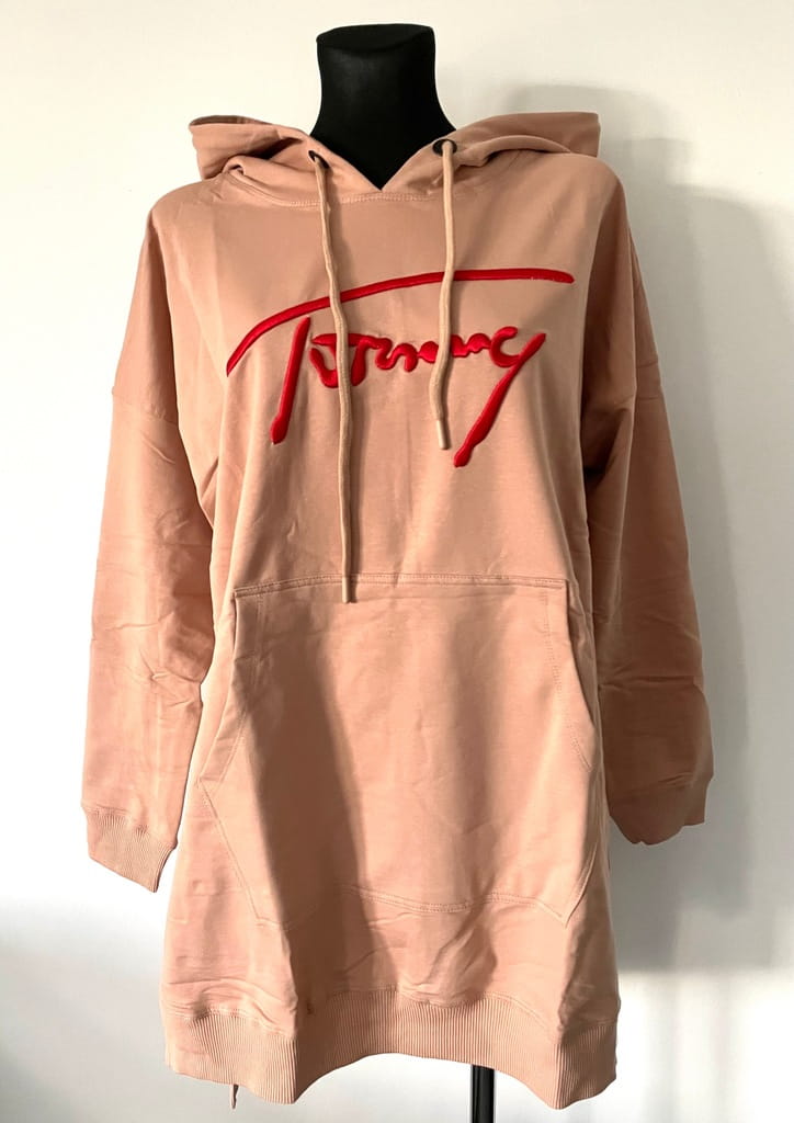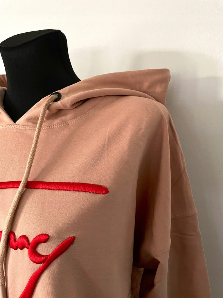 Długa luźna bluza w jasnym karmelowym kolorze z kapturem, kieszenią typu "kangur" i czerwonym wyszywanym napisem "Tommy"