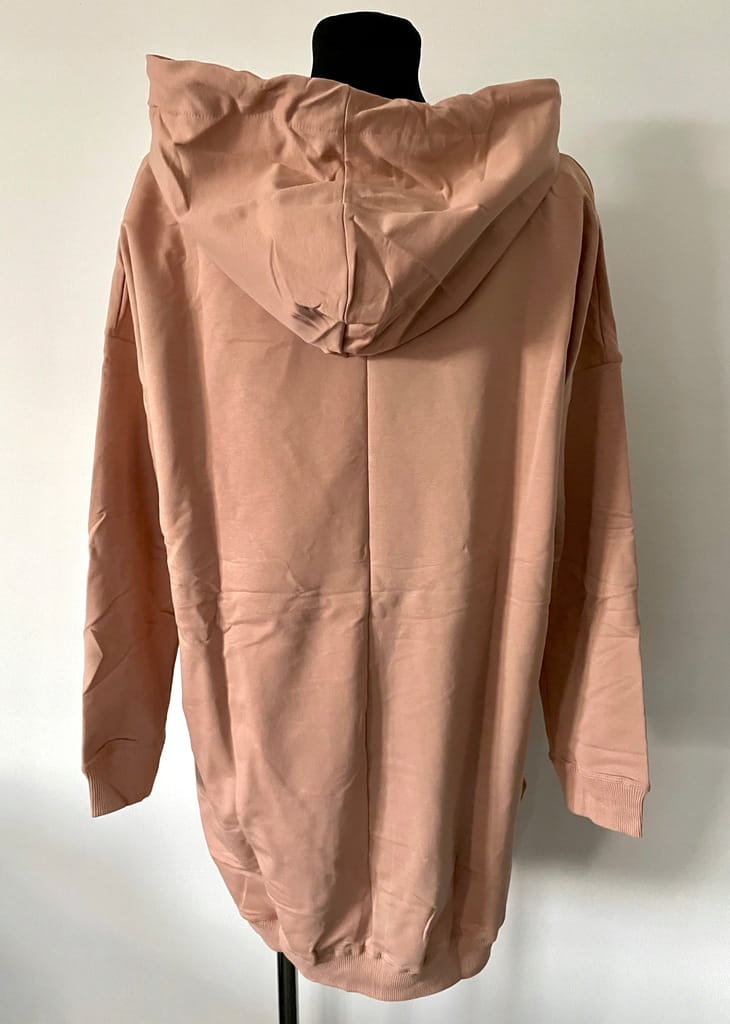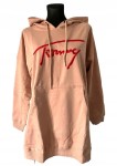 Długa luźna damska bluza w kolorze jasnobrązowym camelowym z kapturem, kieszenią typu "kangur", czerwonym wyszywanym napisem "Tommy" i długim rękawem - r. uniwersalny