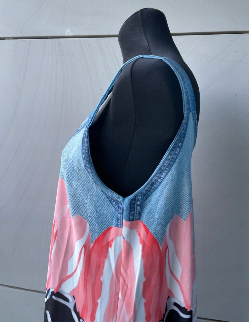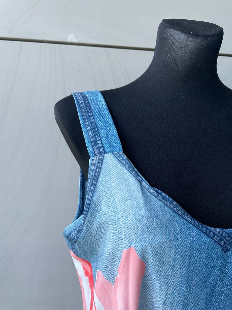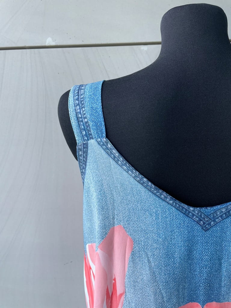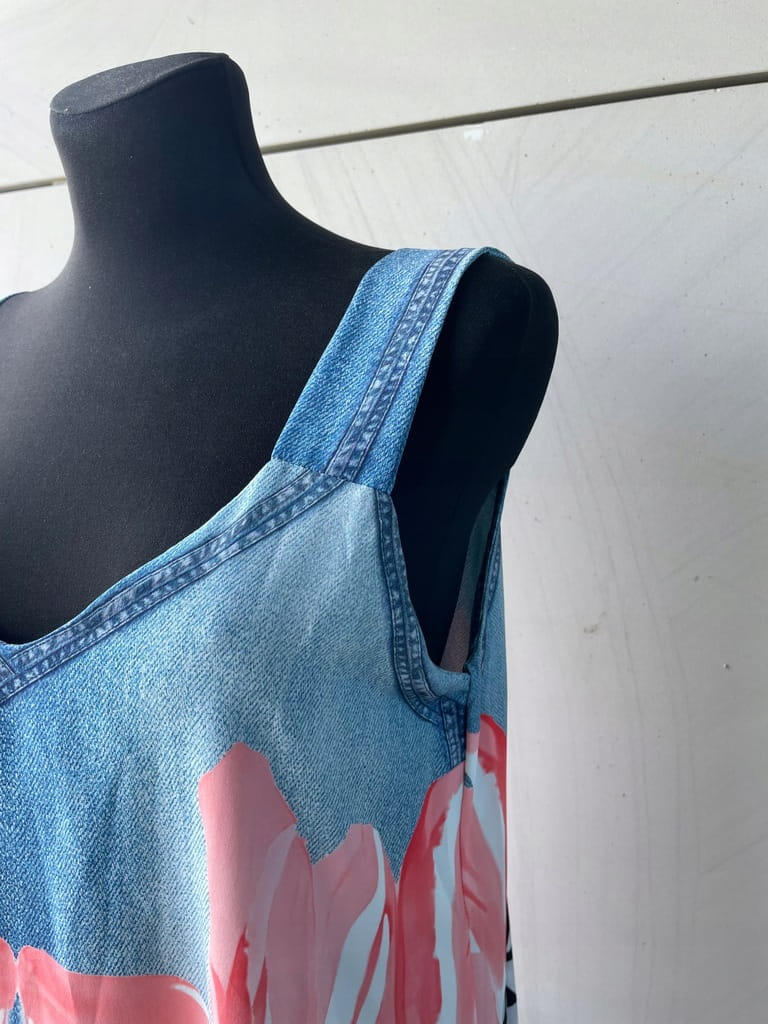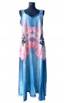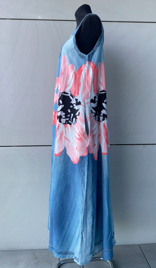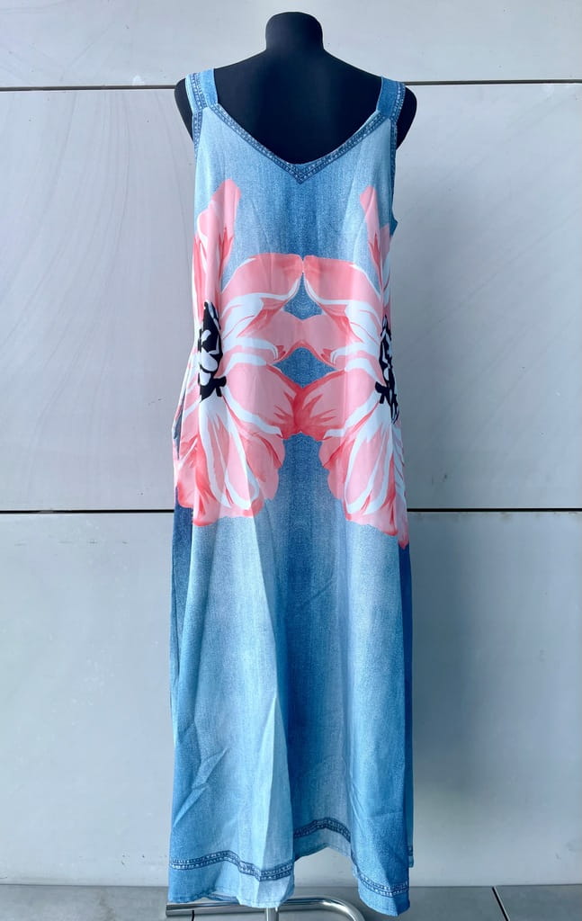 Długa luźna letnia włoska błękitna sukienka w kwiaty, z kieszeniami, bez rękawów, imitacja jeansu - r. uniwersalny