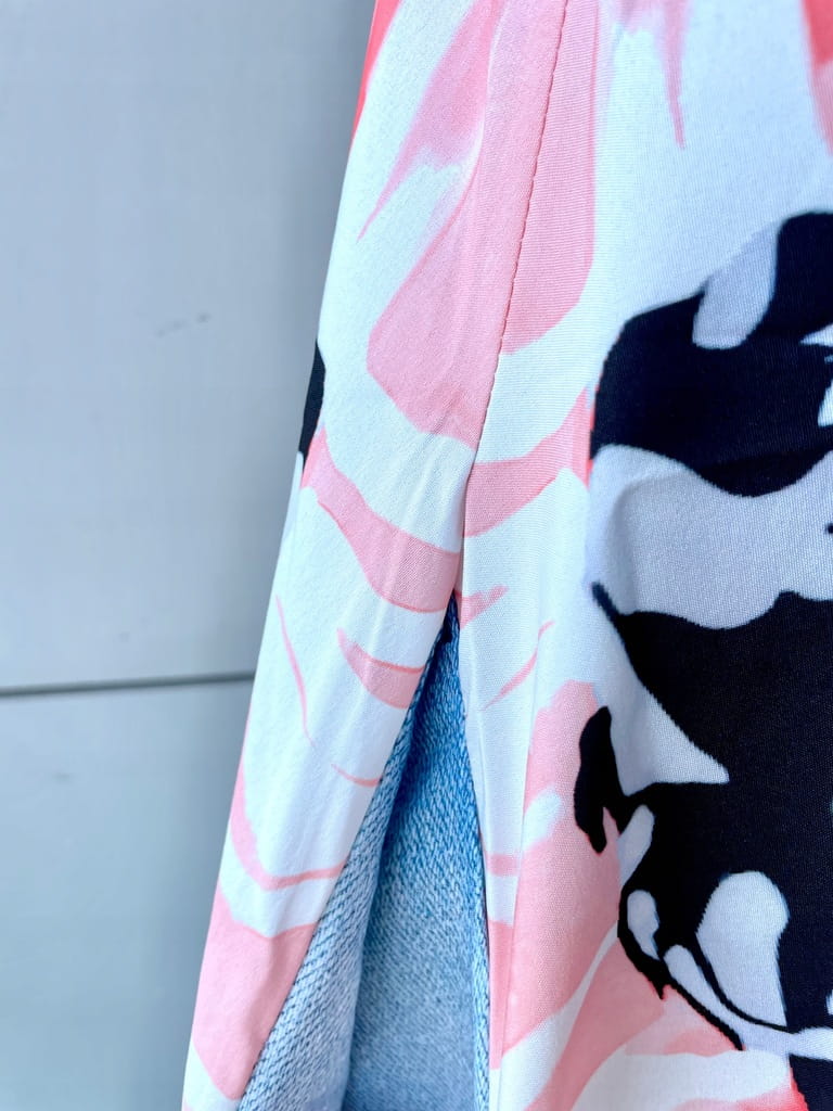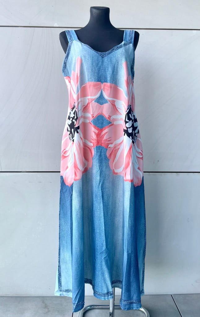 Włoska cienka długa letnia sukienka kolorze niebieskim (imitacja jeansu) z motywem kwiatowym z kieszeniami