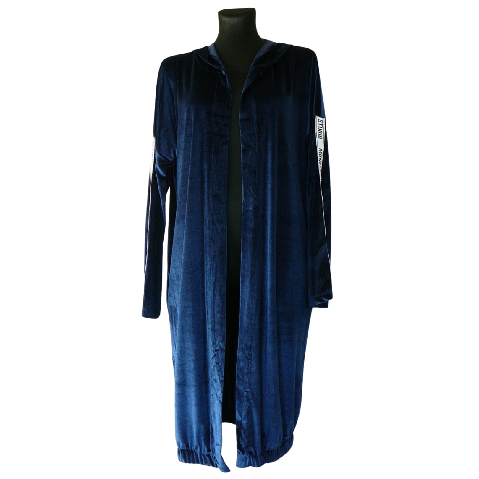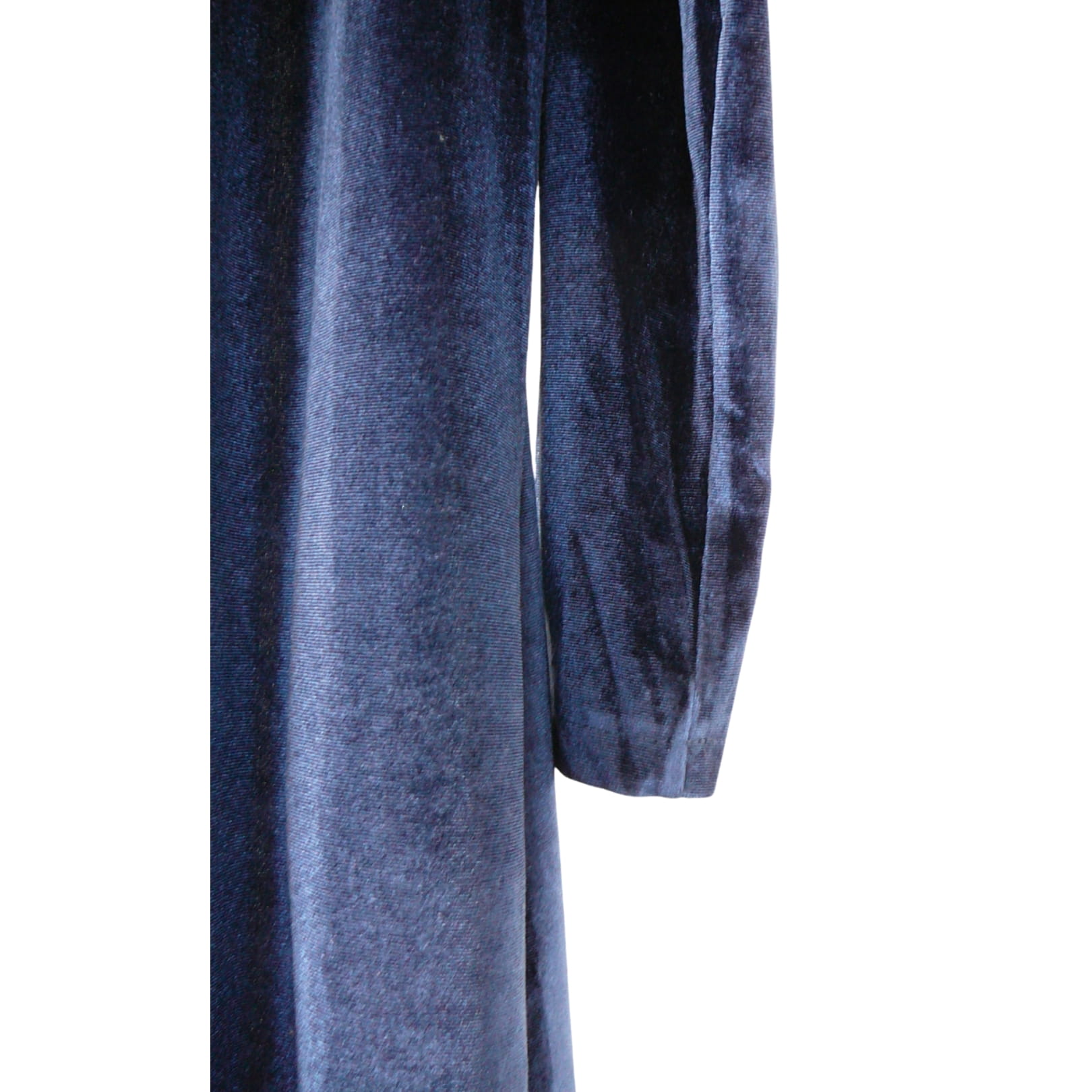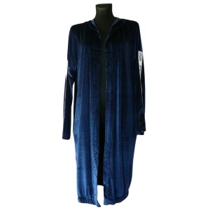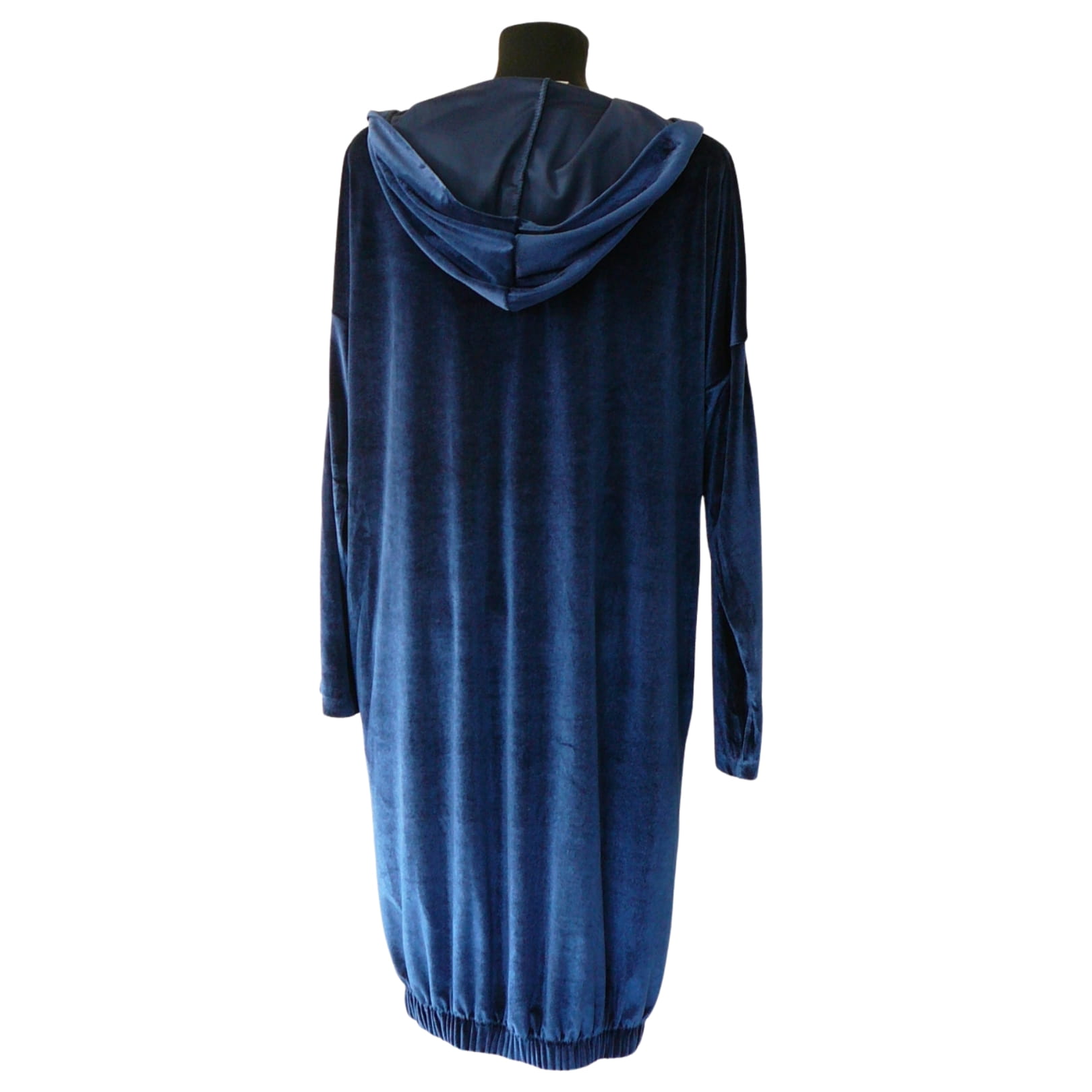 Długa welurowa włoska damska narzutka w granatowym kolorze, z kapturem, kieszeniami i długim rękawem - r. uniwersalny