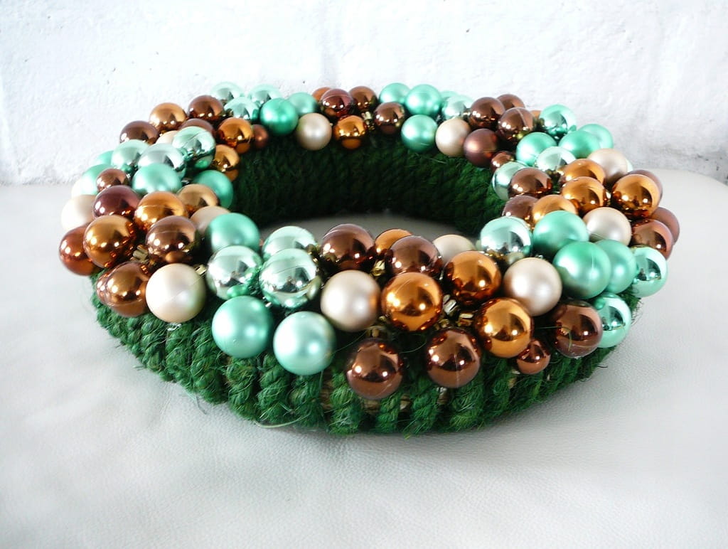 Duży świąteczny bożonarodzeniowy wianek na drzwi i stół, z bombkami w odcieniach zieleni i brązu - unikatowe, polskie rękodzieło