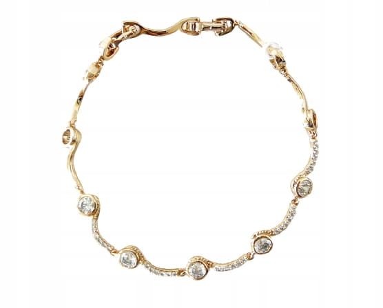 Elegancka damska bransoletka platerowana 24-karatowym złotem, z oczkami i przeźroczystymi cyrkoniami, zapinana na klips, z odpinaną przedłużką