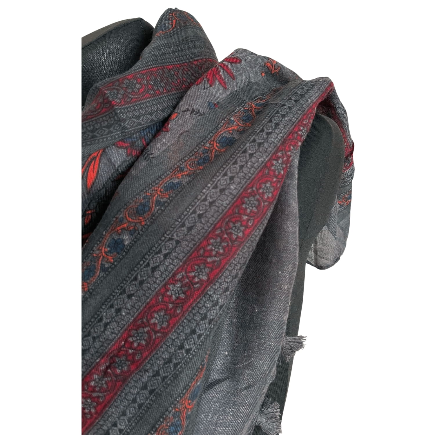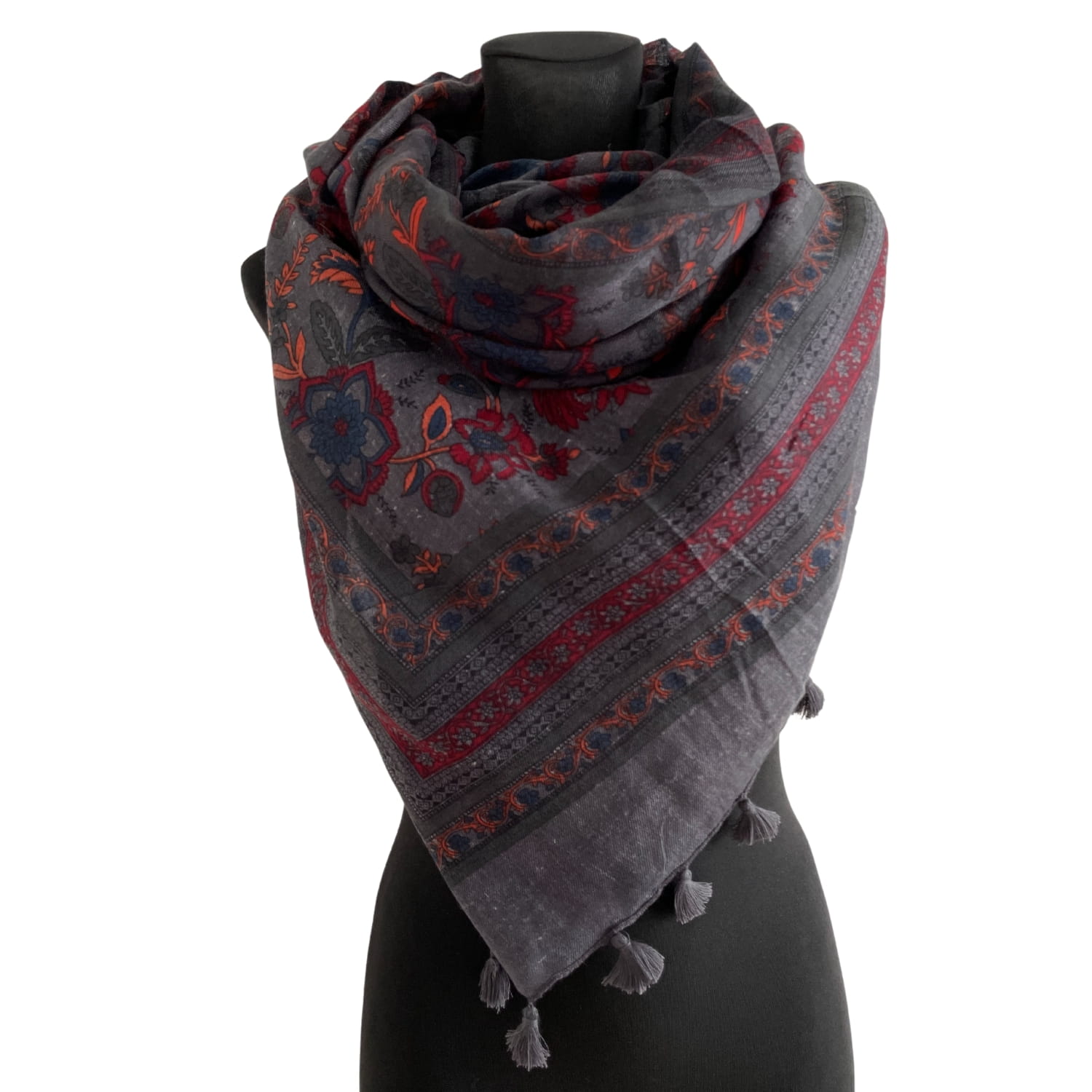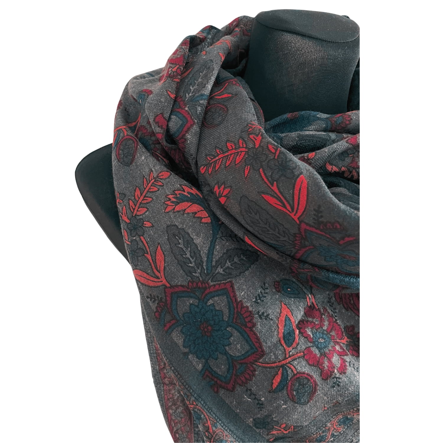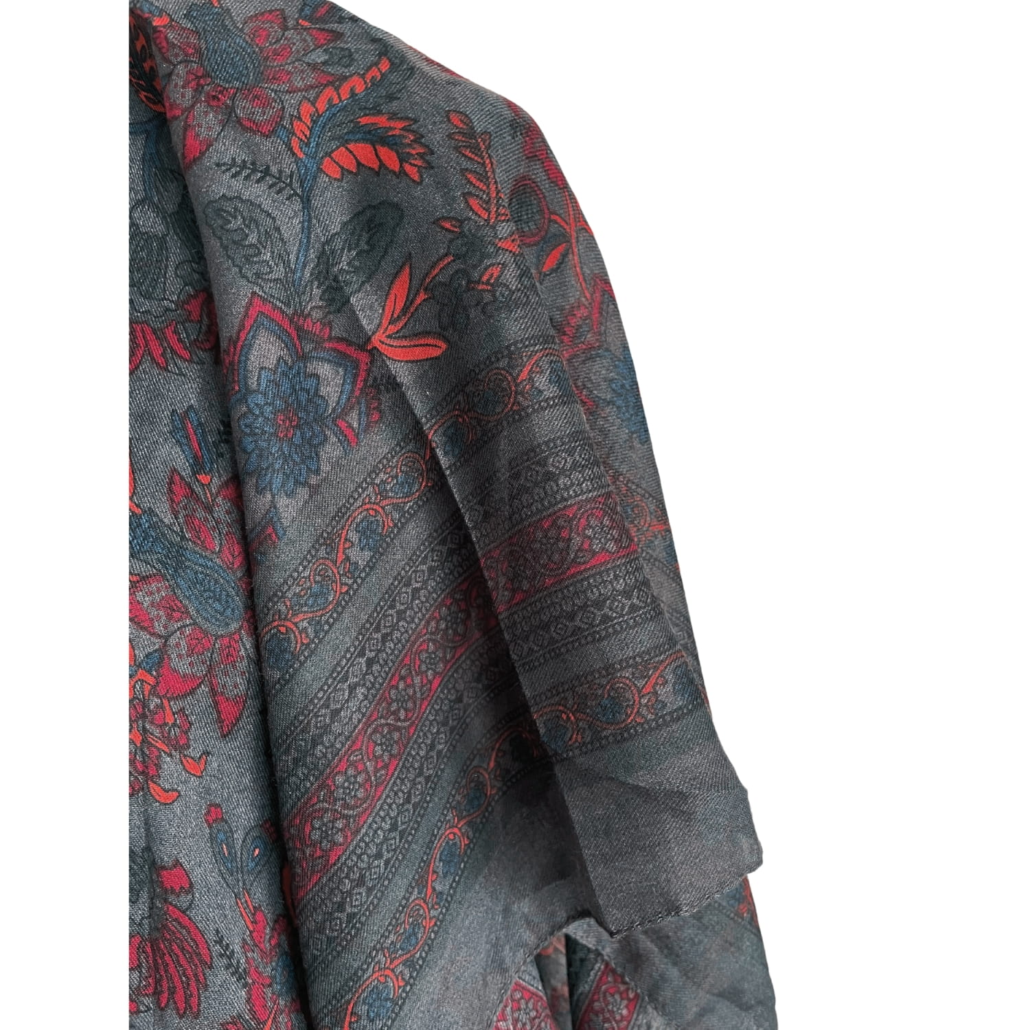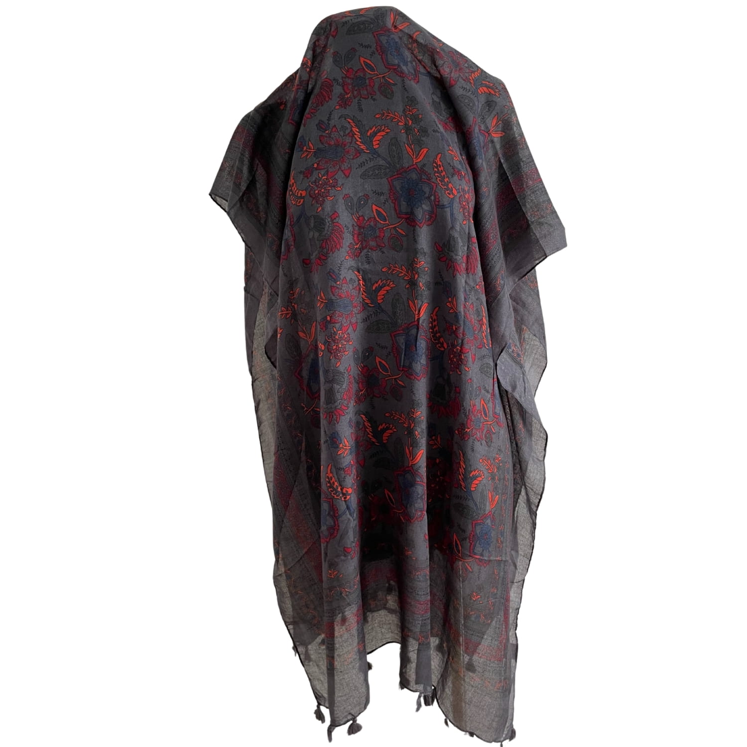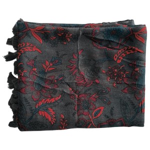 Grafitowa elegancka damska chusta/ cienki szal w koralowe roślinne wzory, z frędzlami - ok. 200 x 80 cm
