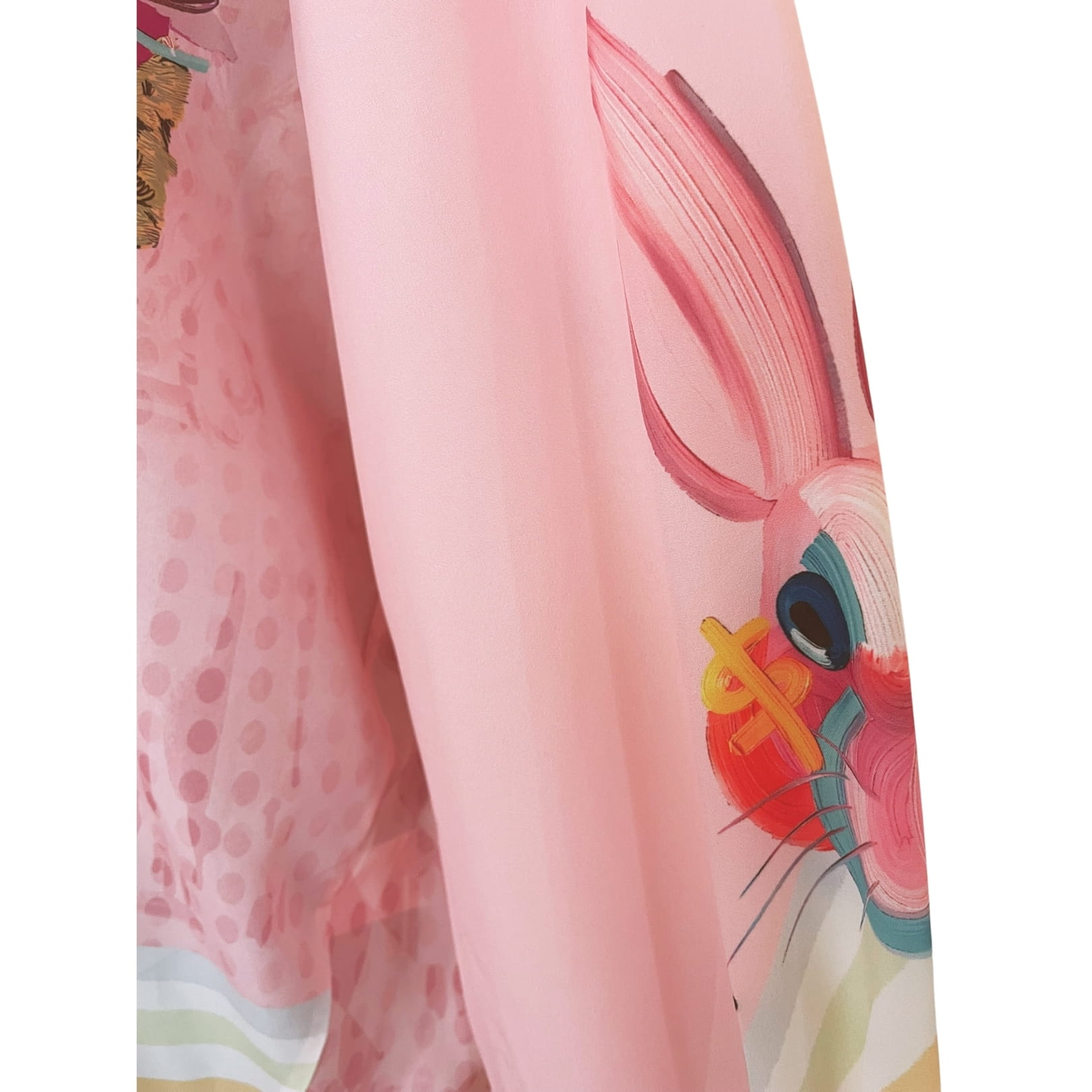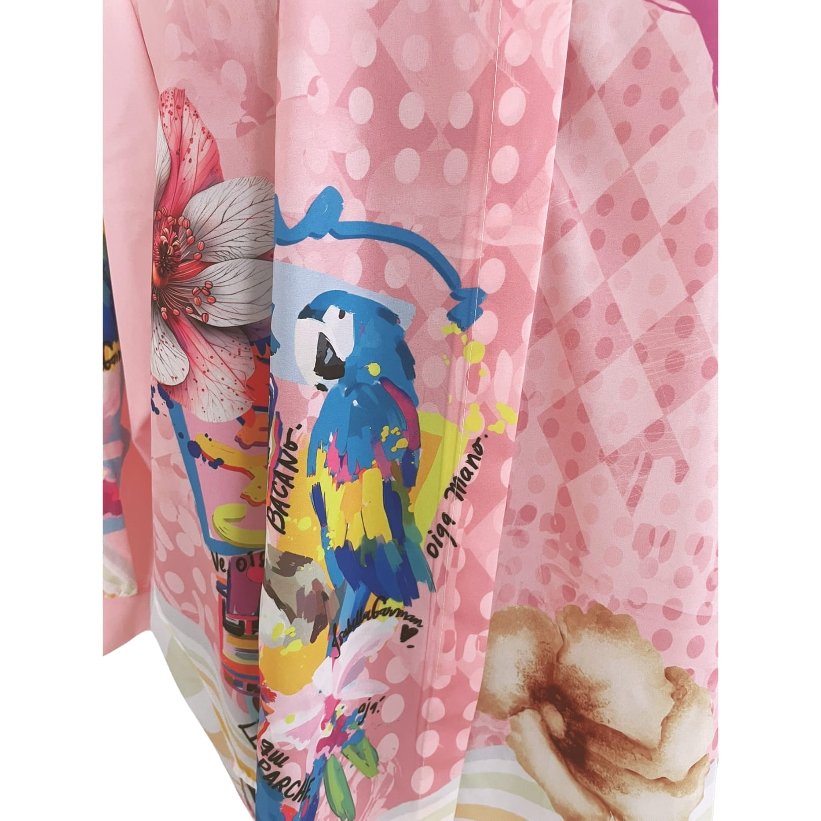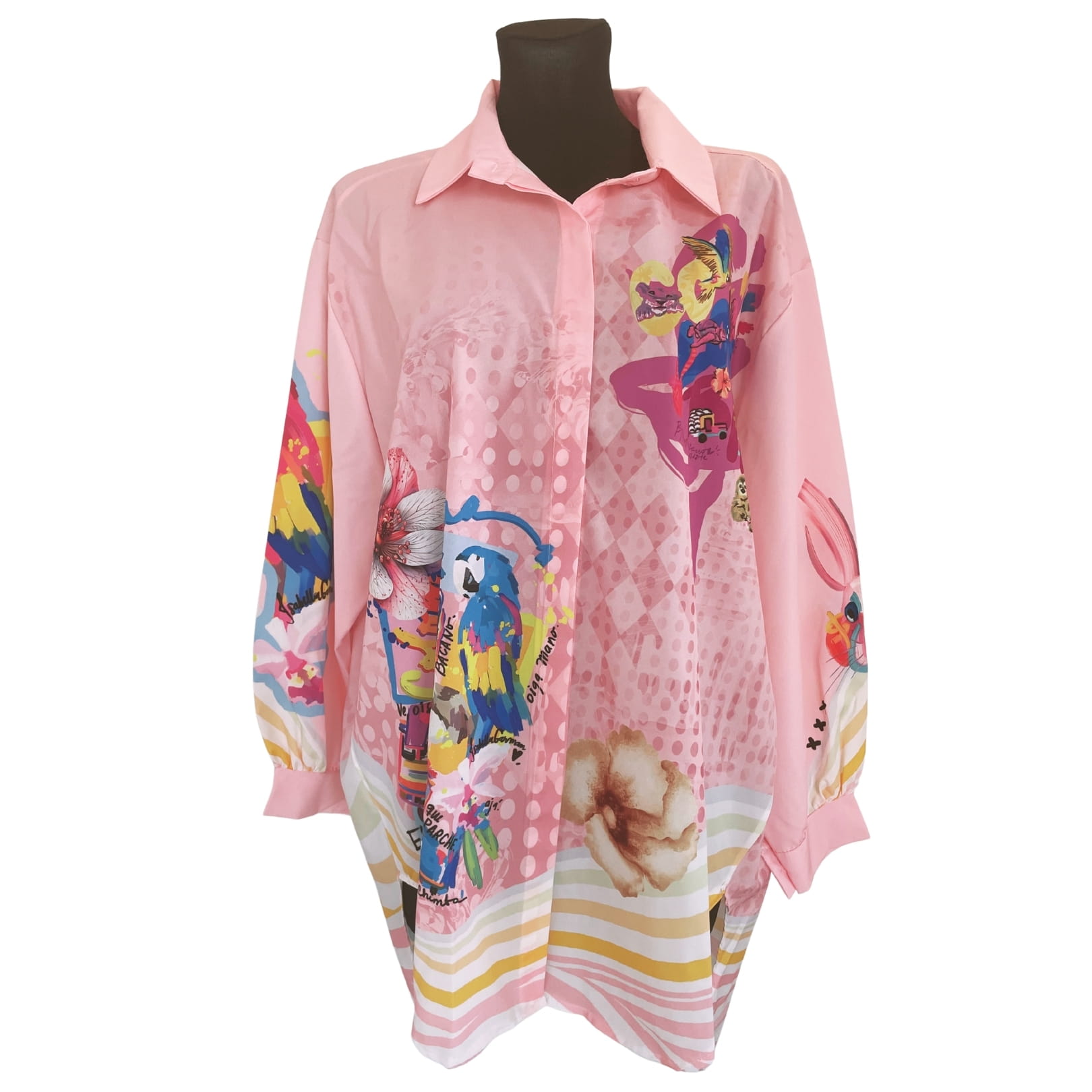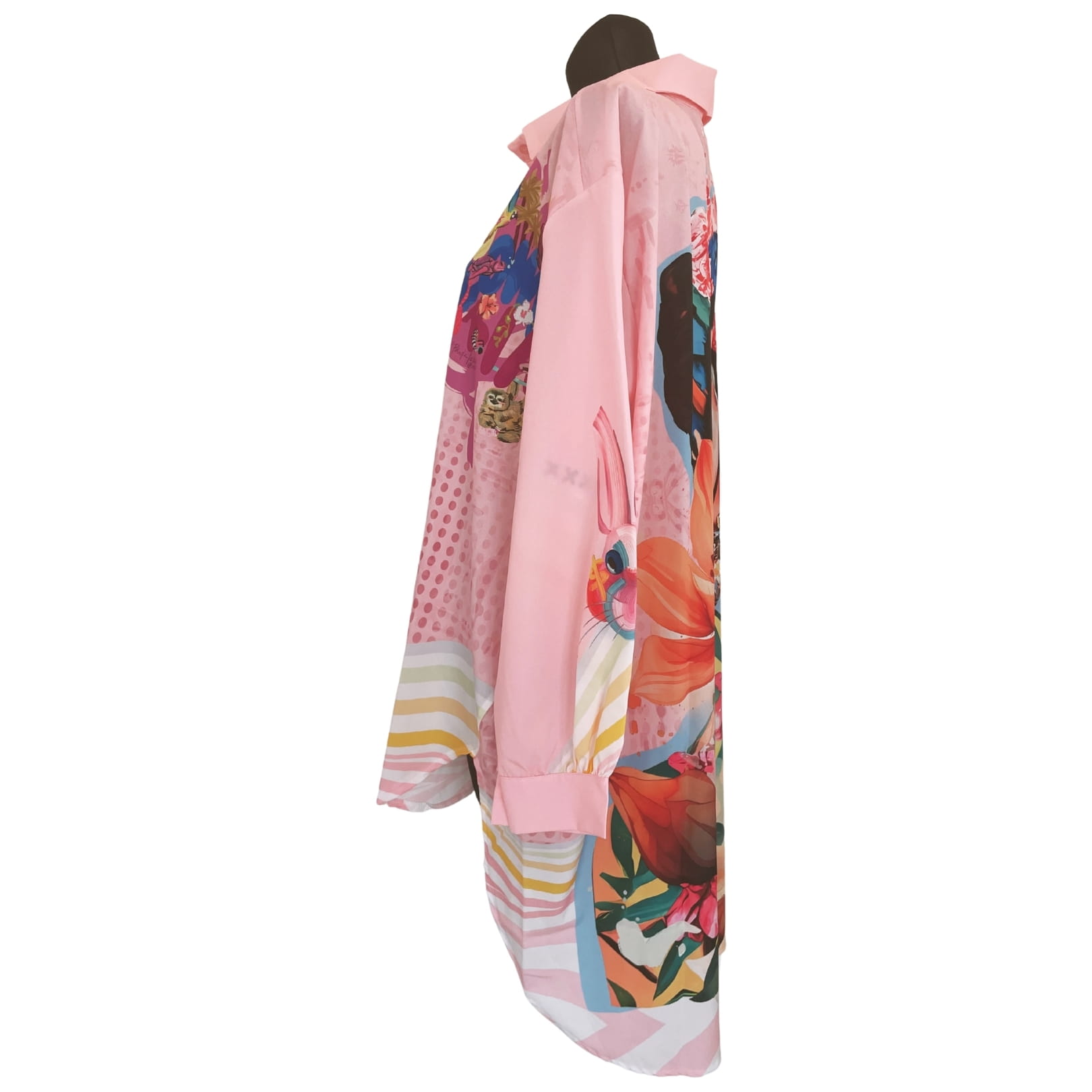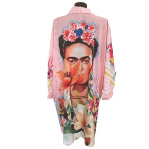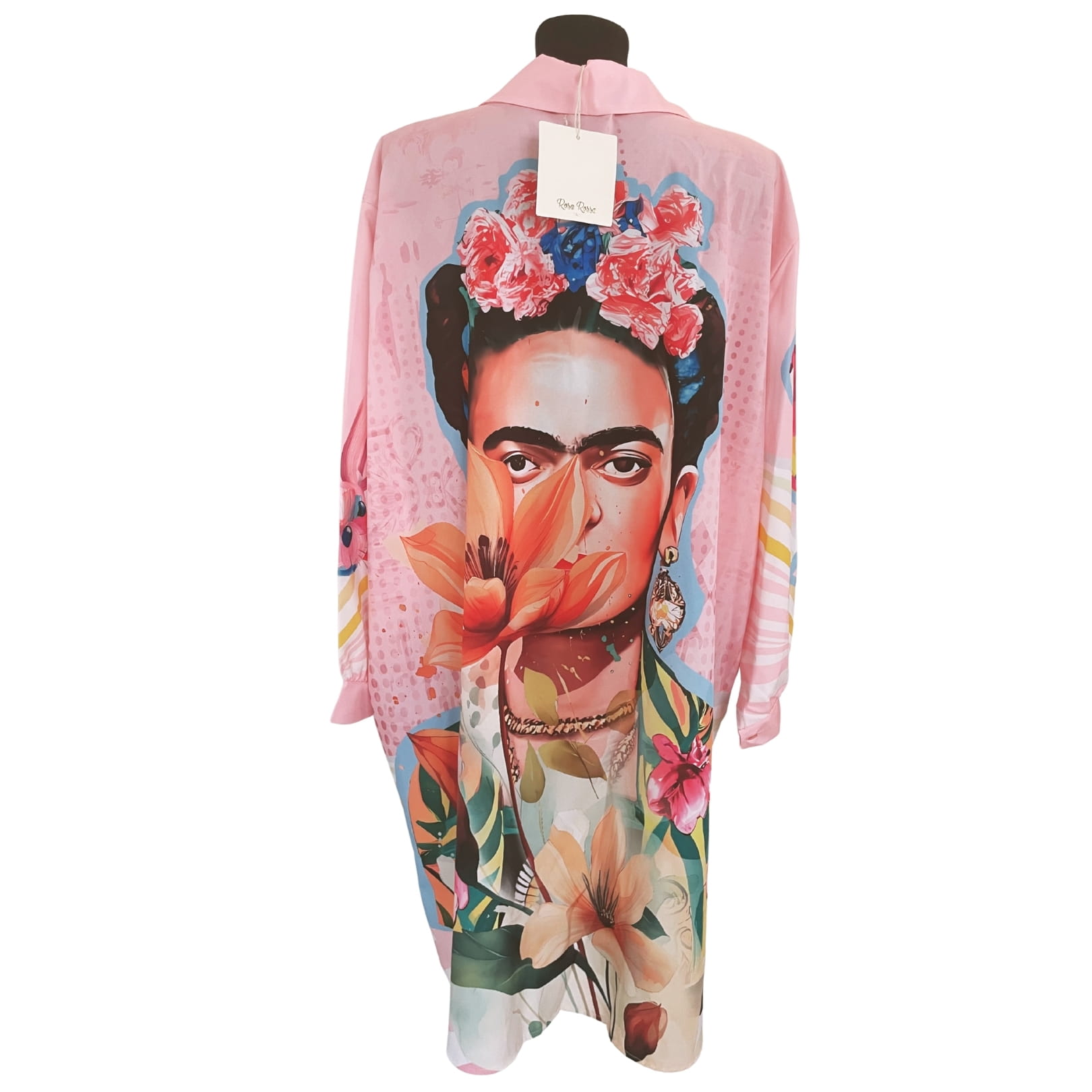 Awangardowa asymetryczna długa włoska cienka koszula w kolorze jasnoróżowym, zapinana na guziki, z nadrukiem zwierząt i roślin oraz twarzy Fridy na plecach