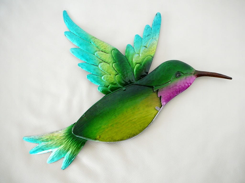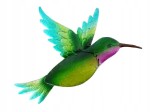 Kolorowy, zielono-żółto-turkusowo-różowy metalowy ptak koliber wykonany z metalu i szkła - dekoracja do domu, na ścianę itp.