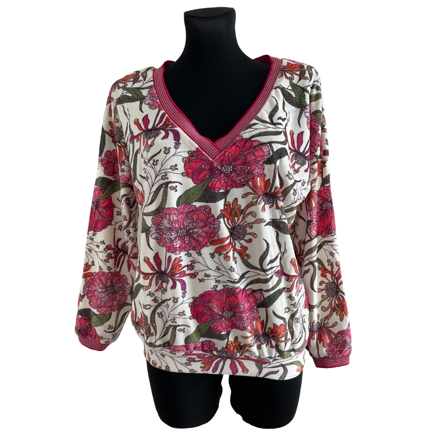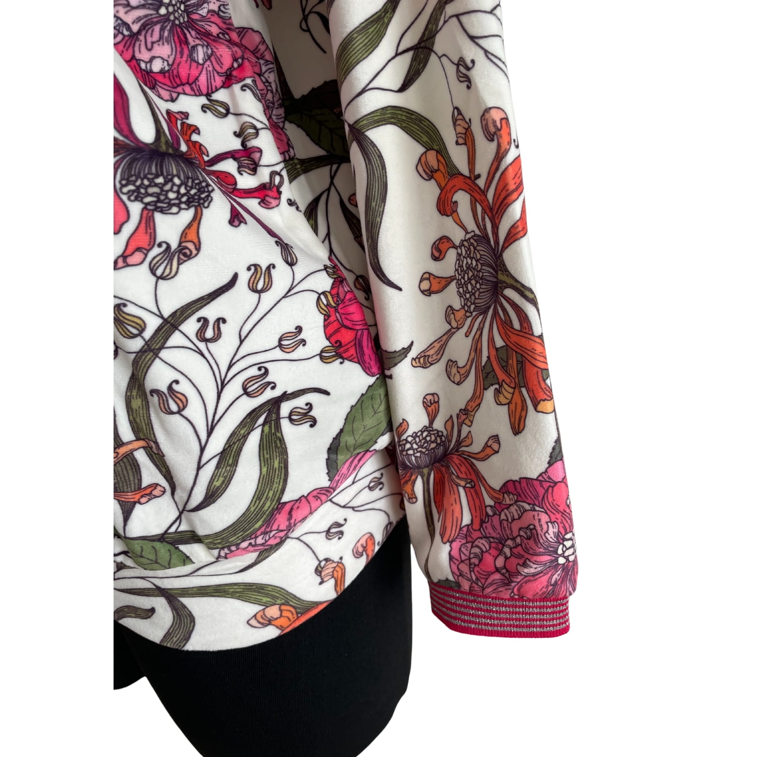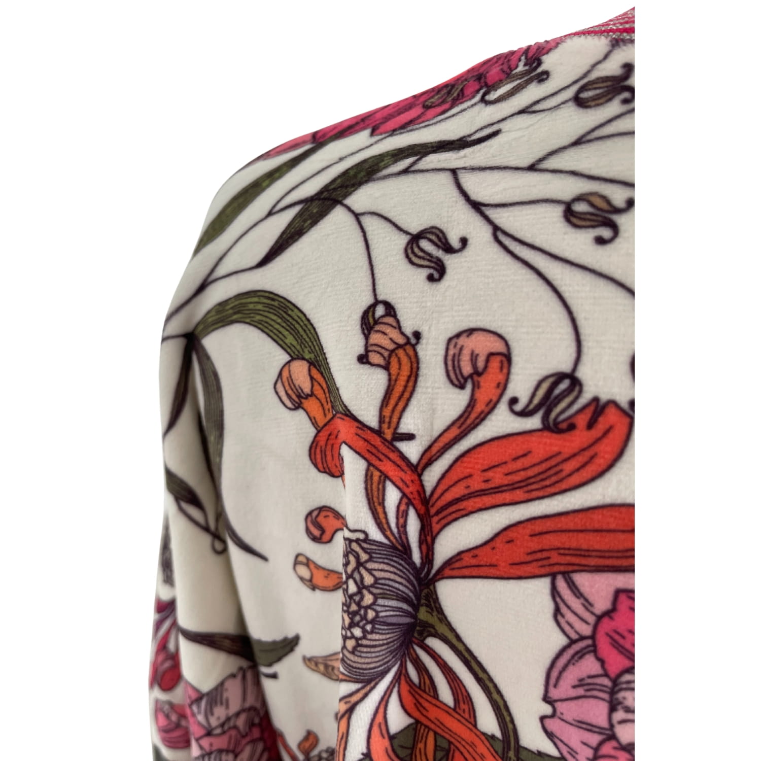 Kremowa damska cienka luźna welurowa bluza/ bluzka w kolorowe kwiaty, z dekoltem w serek typu V i długim rękawem - rozmiar 36/38 S/M