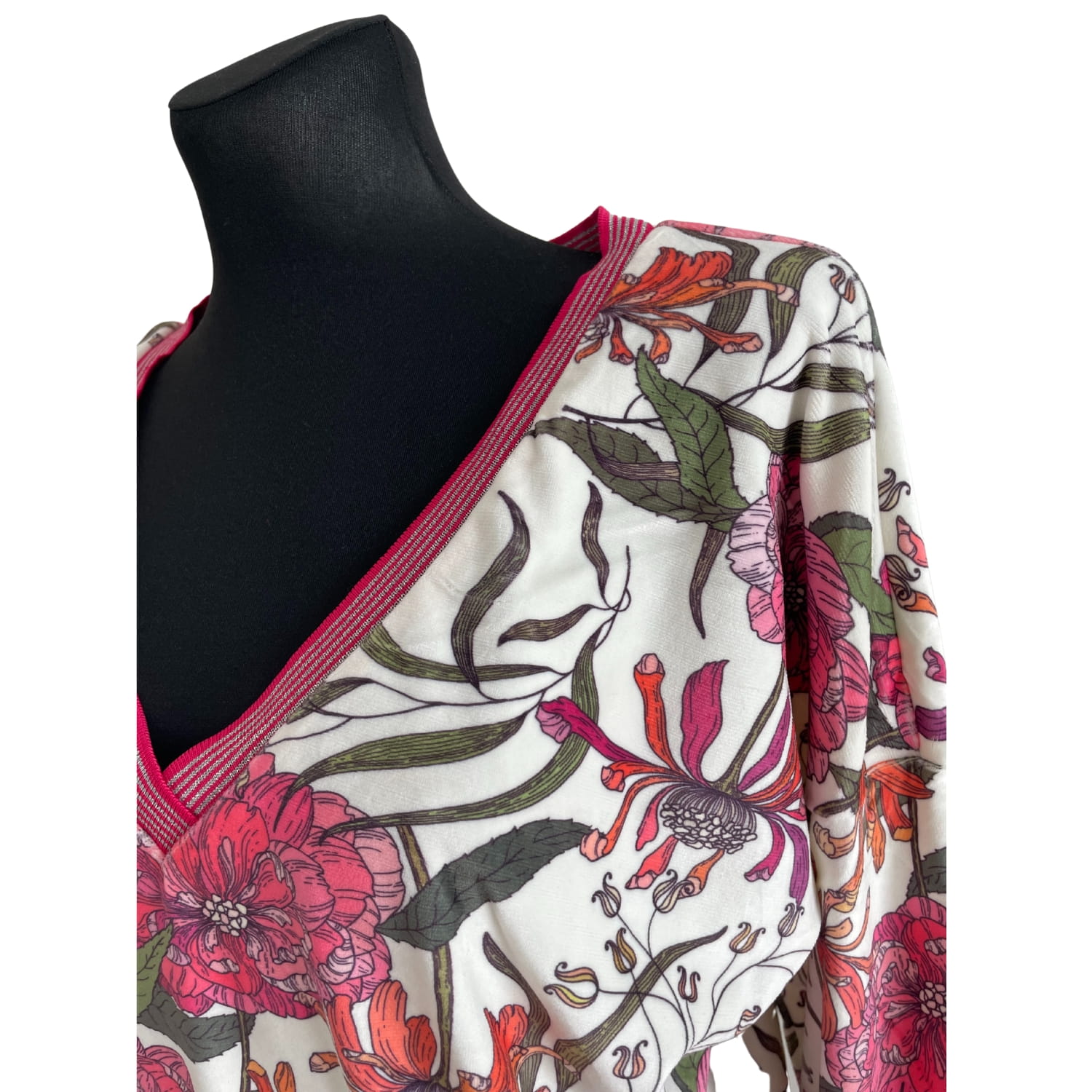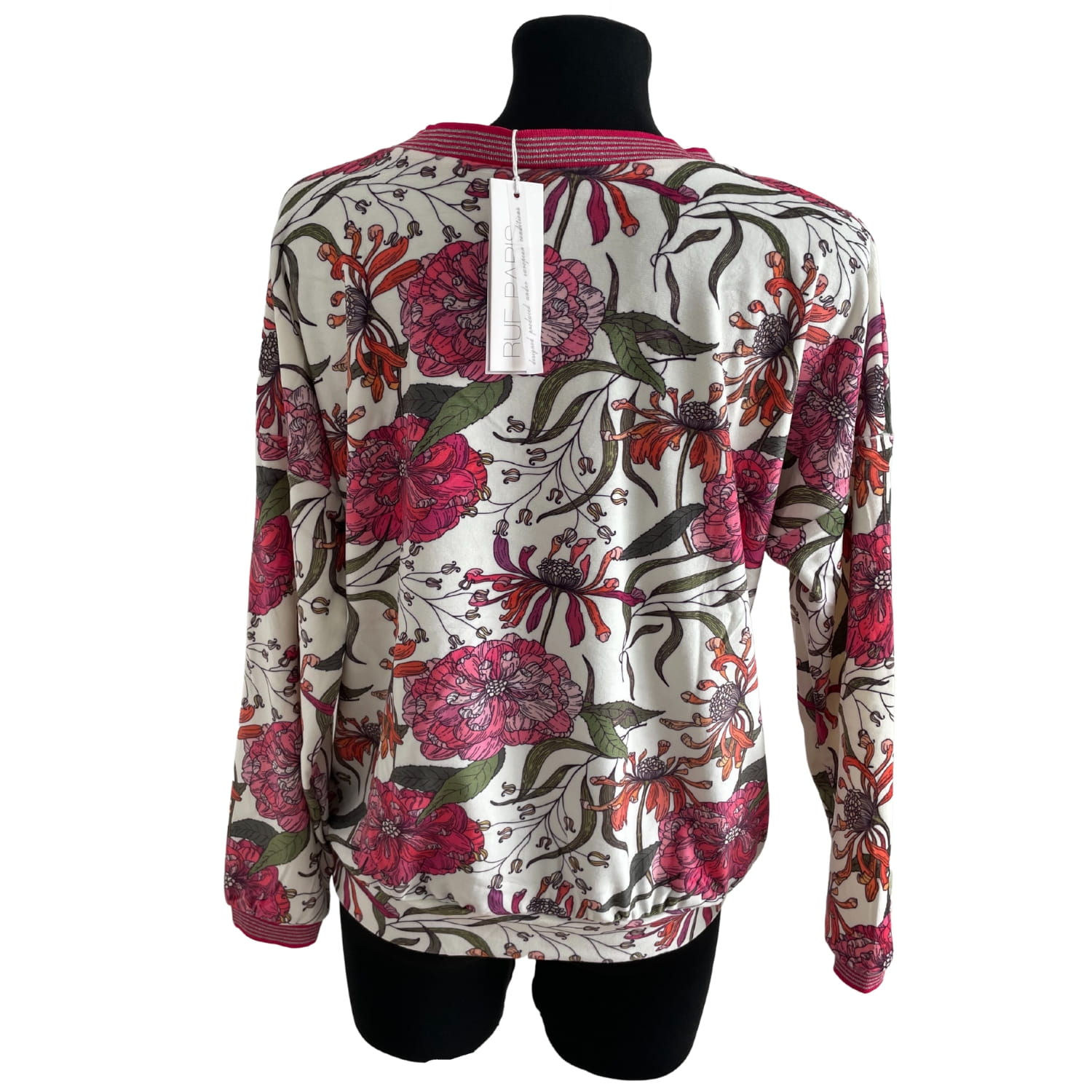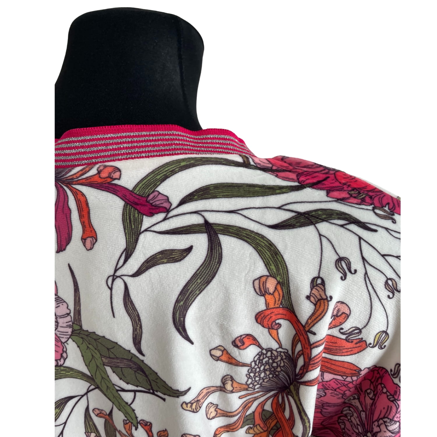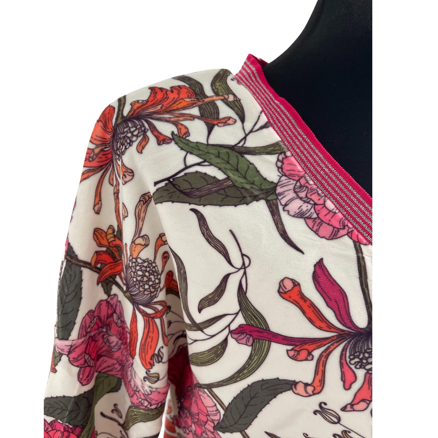 Kremowa damska cienka luźna welurowa bluza/ bluzka w kolorowe kwiaty, z dekoltem w serek typu V i długim rękawem - rozmiar 36/38 S/M