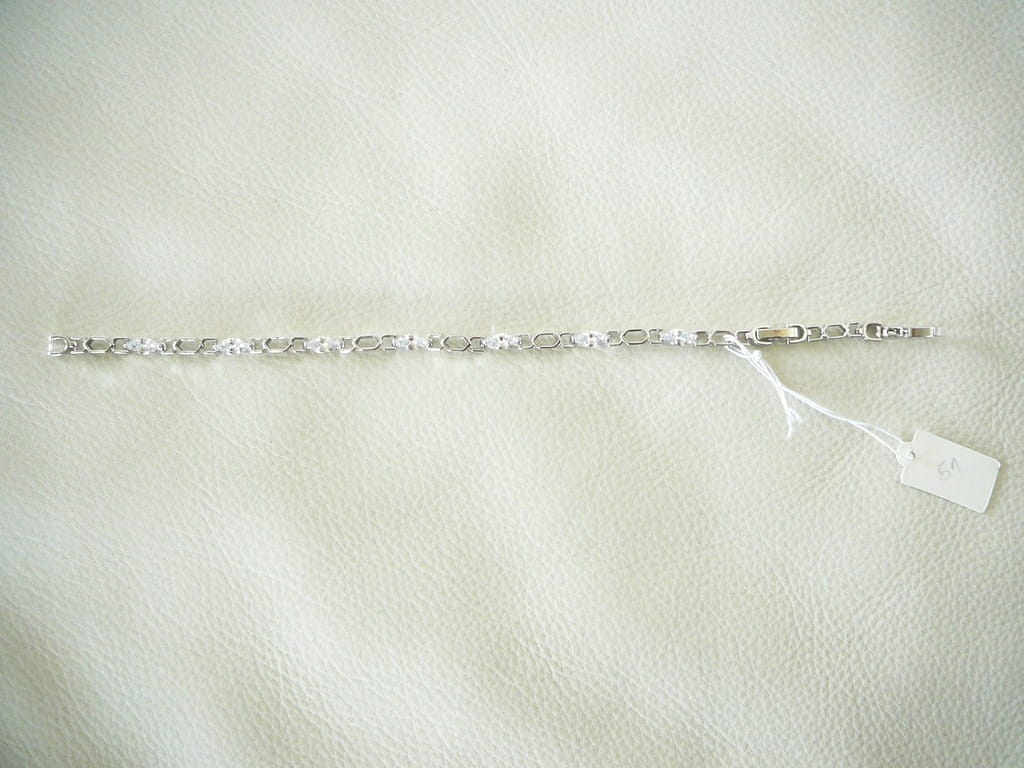 Łańcuszkowa bransoletka platerowana białym złotem, z podłużnymi cyrkoniami, zapinana na klips, z odpinaną przedłużką
