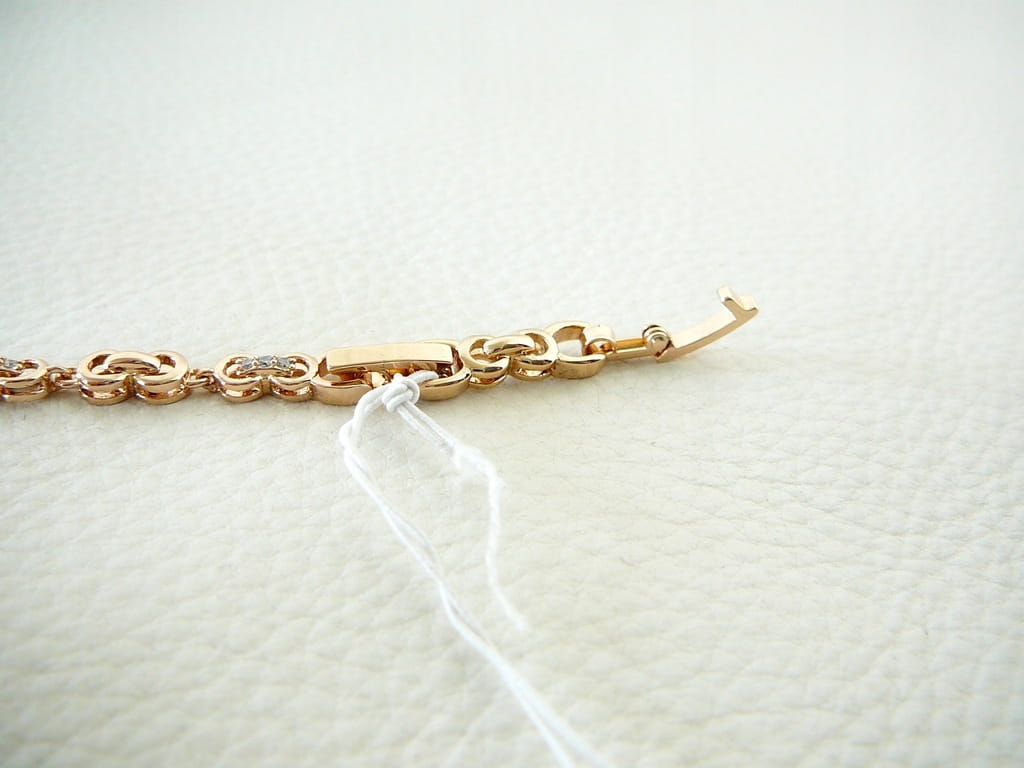 Łańcuszkowa damska bransoletka platerowana 24-karatowym złotem, z połyskującymi, przeźroczystymi cyrkoniami, zapinana na klips, z odpinaną przedłużką /wzór: kółka/