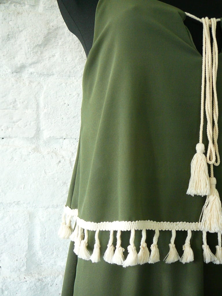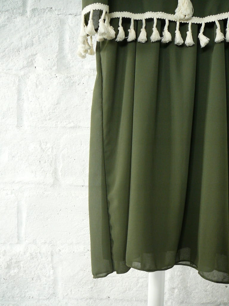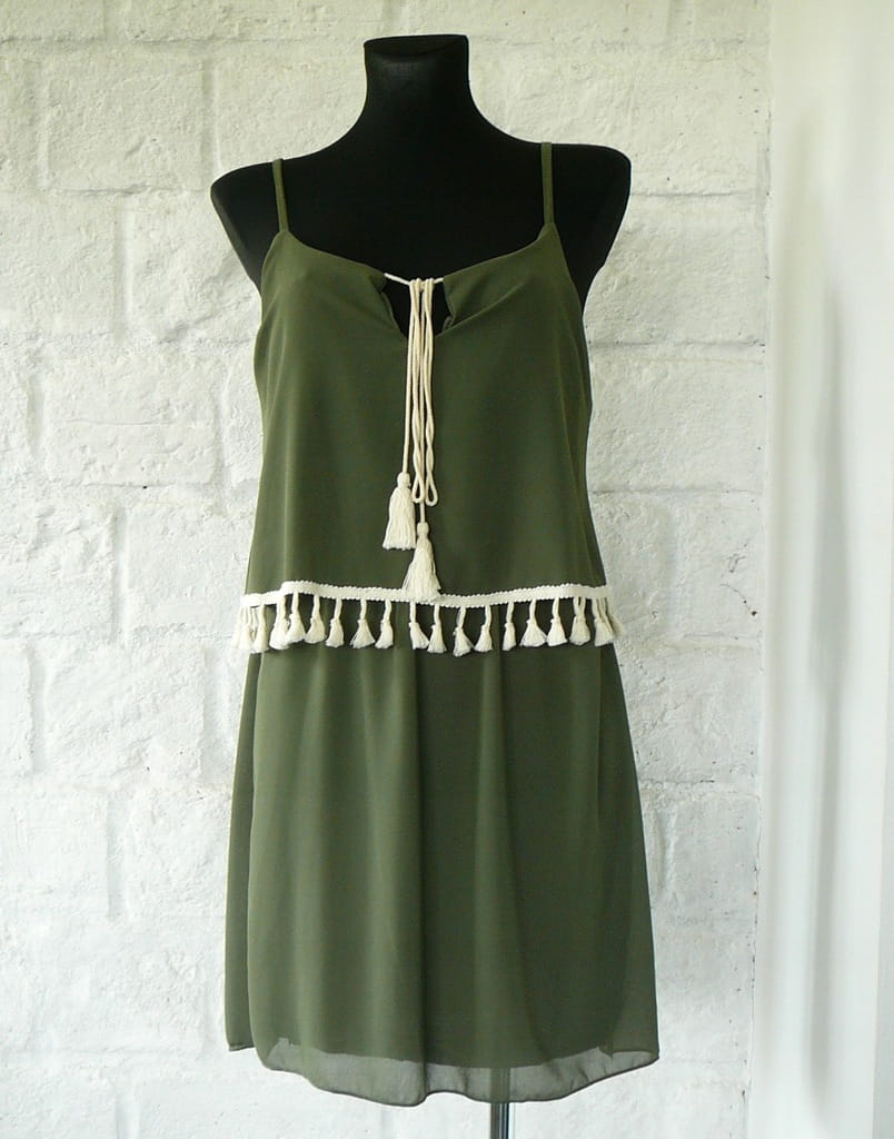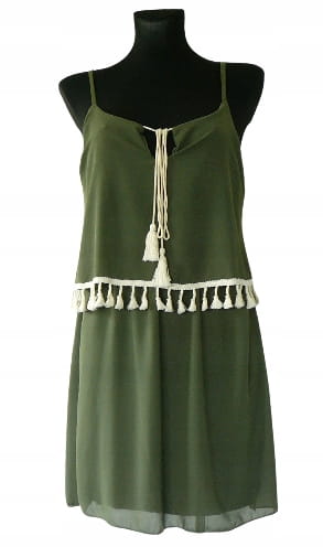 Letnia sukienka w kolorze zielonym khaki z ozdobnymi kremowymi frędzlami i podszewką, na ramiączkach - rozmiar 38 M - Haily's