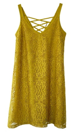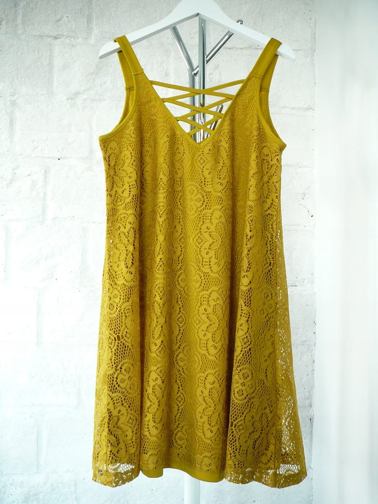 Luźna, rozszerzana, musztardowa tunika/ krótka sukienka, z koronką i podszewką, na ramiączkach - rozmiar 36 S - Top Secret
