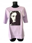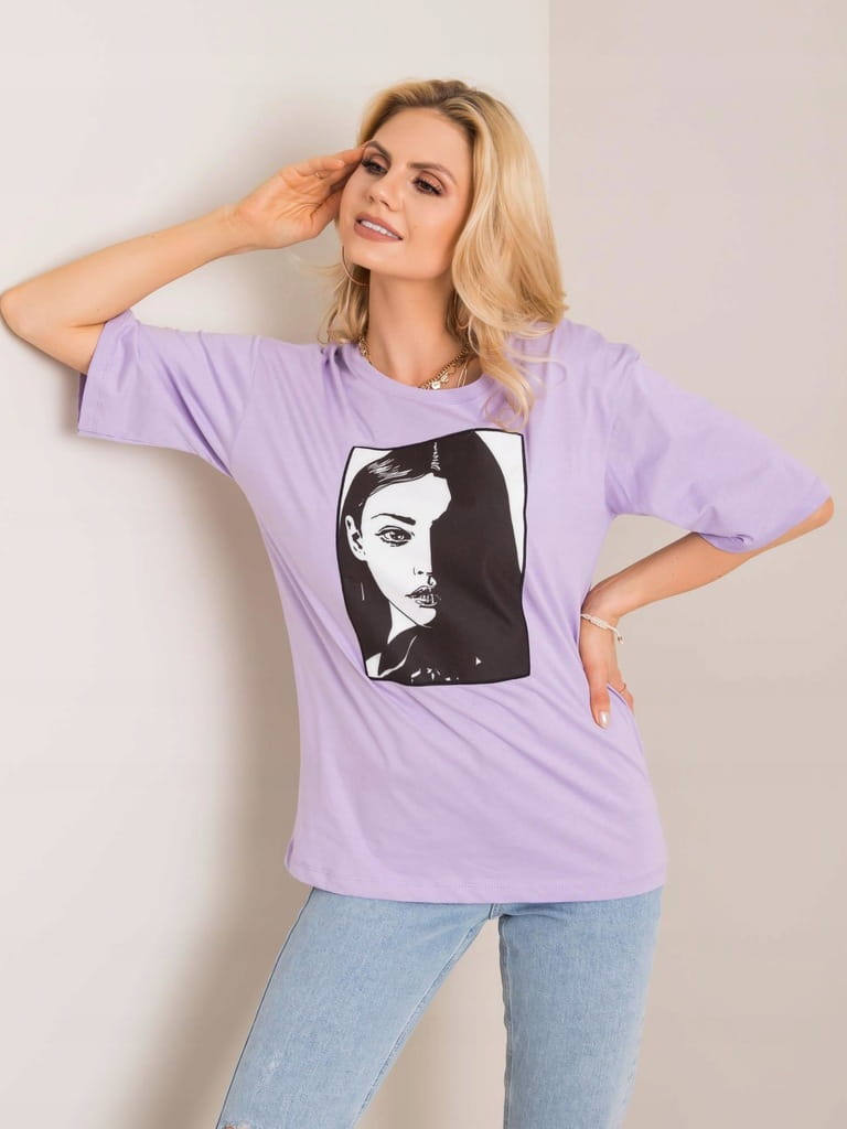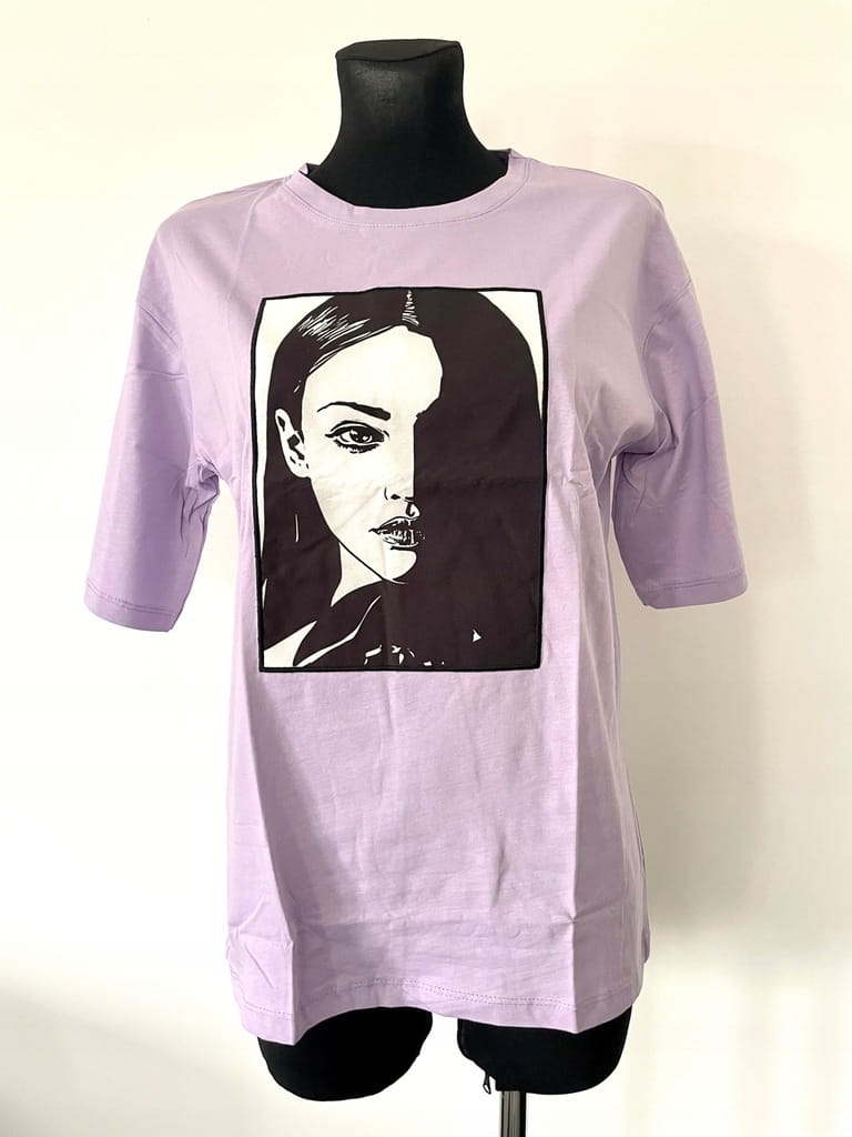 Luźna jasnofioletowa bluzka/ t-shirt z czarno-białą naszywką z twarzą kobiety