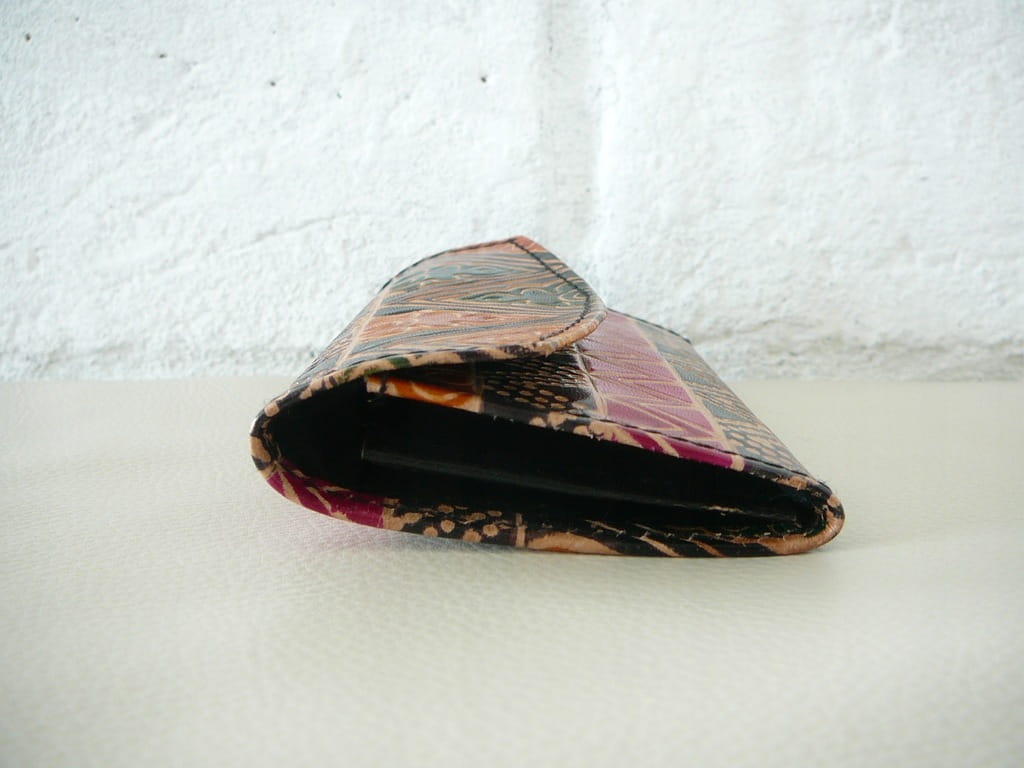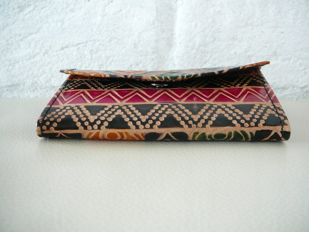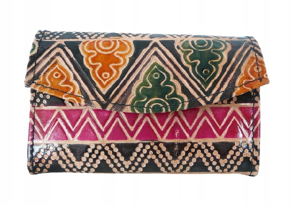 Mały, kolorowy, czarny, skórzany damski portfel ze skóry naturalnej w kolorowe wzory i zygzaki, z tłoczeniami