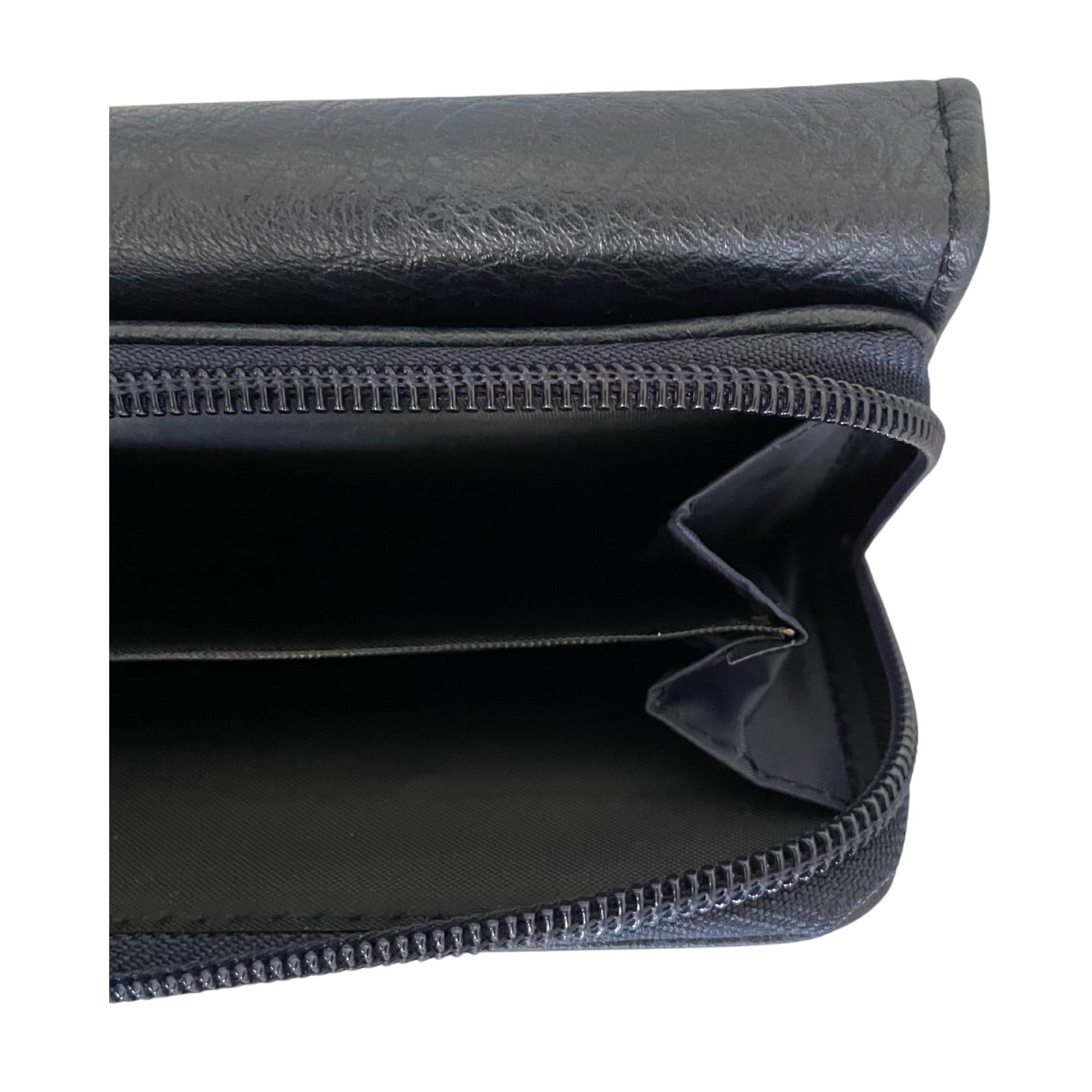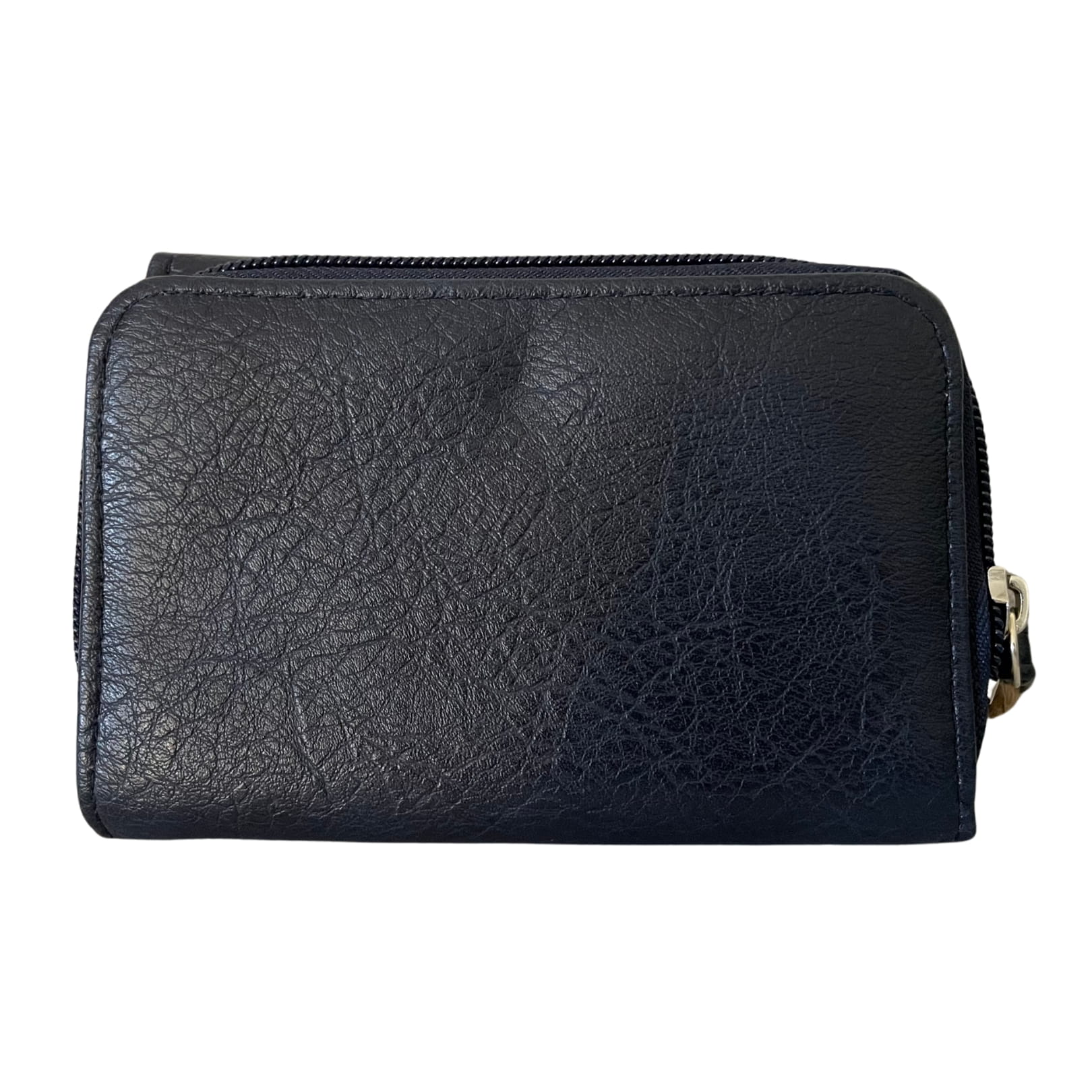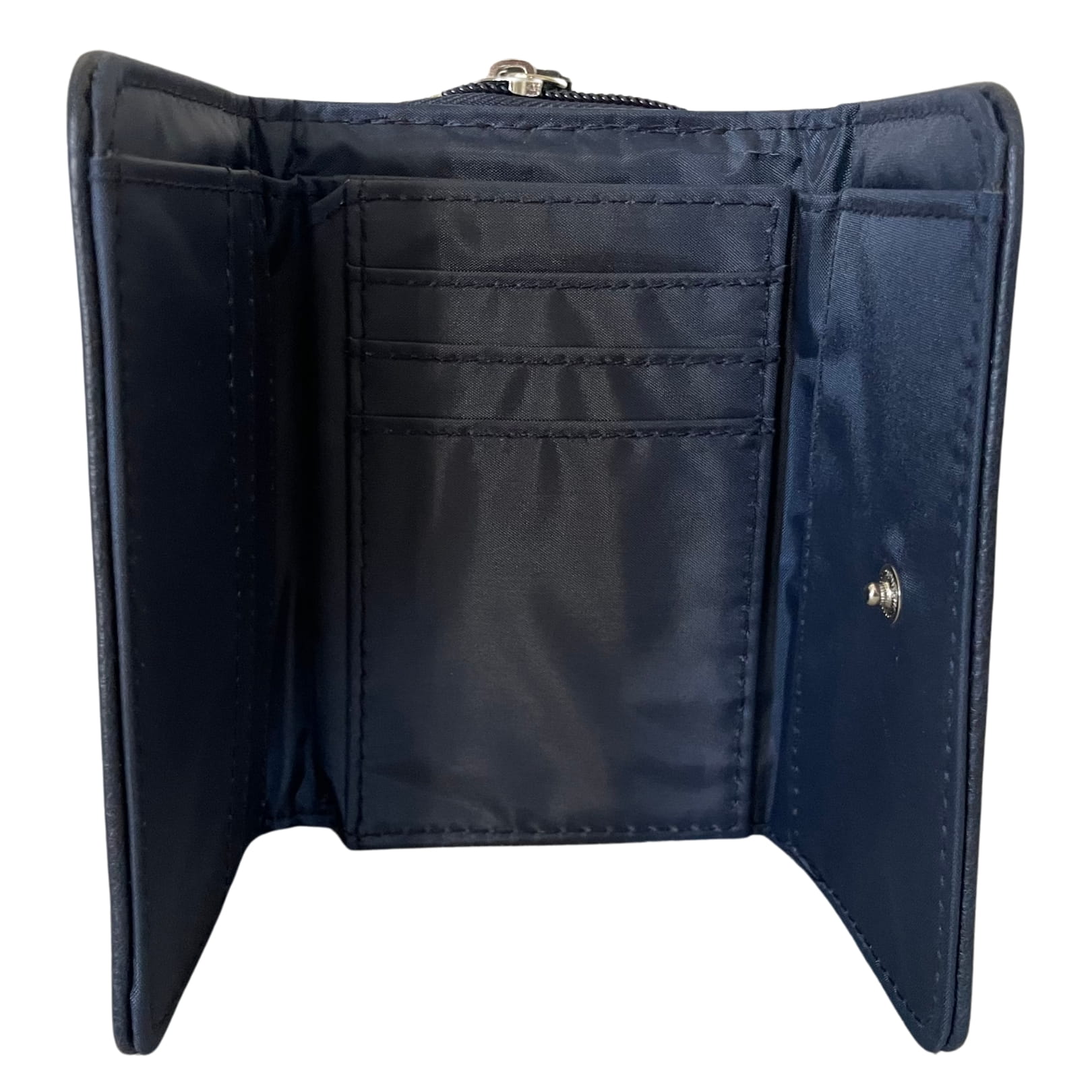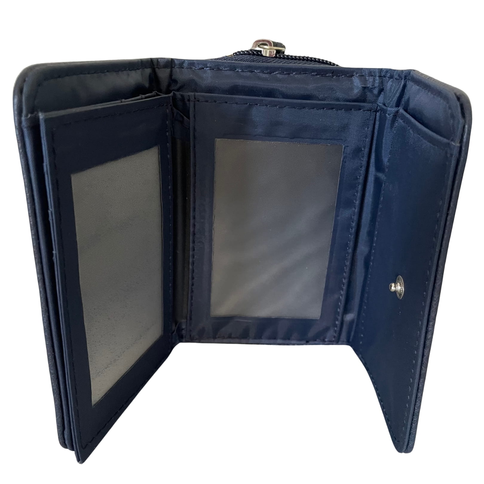 Granatowy, pojemny, rozkładany portfel z miejscem na banknoty, bilon i karty