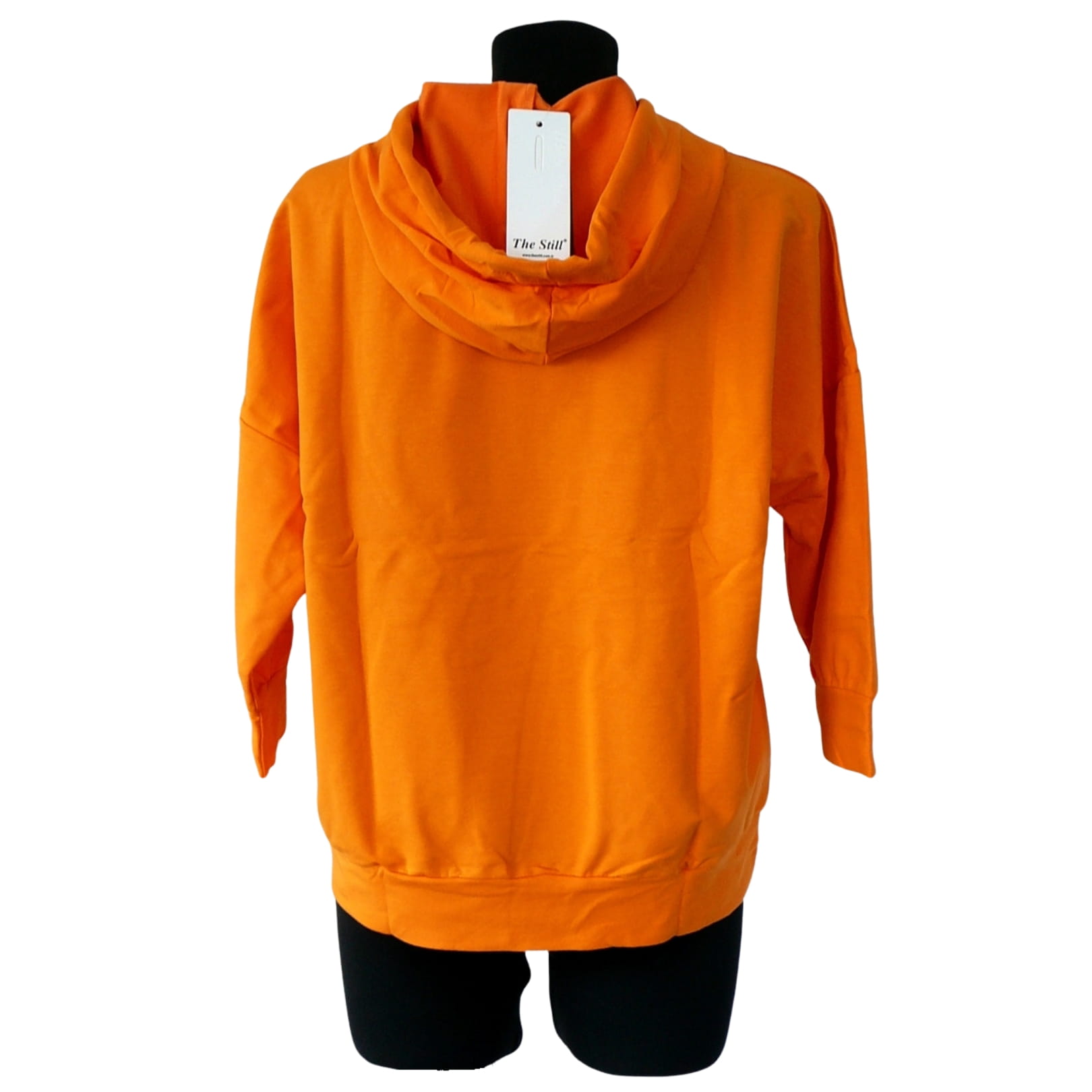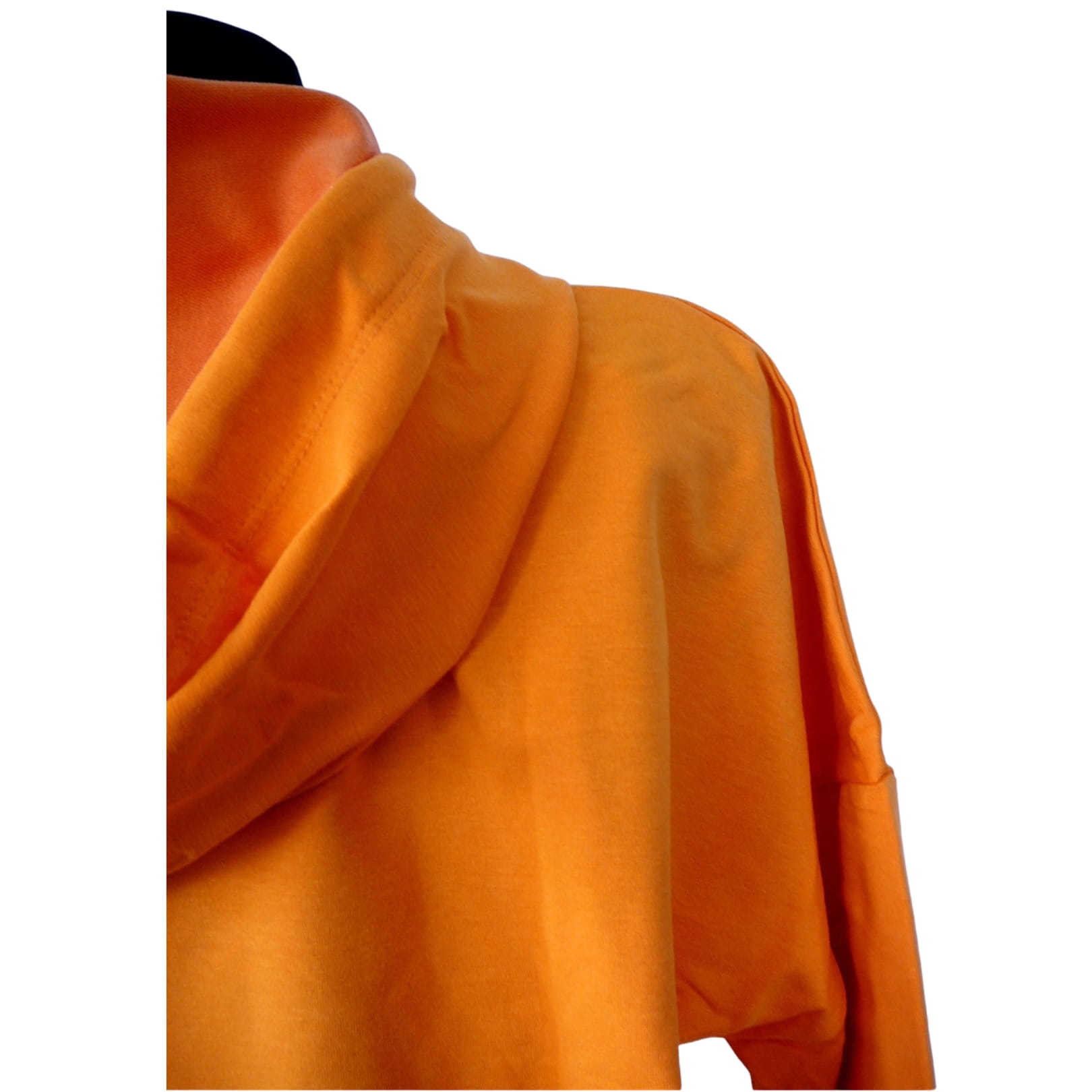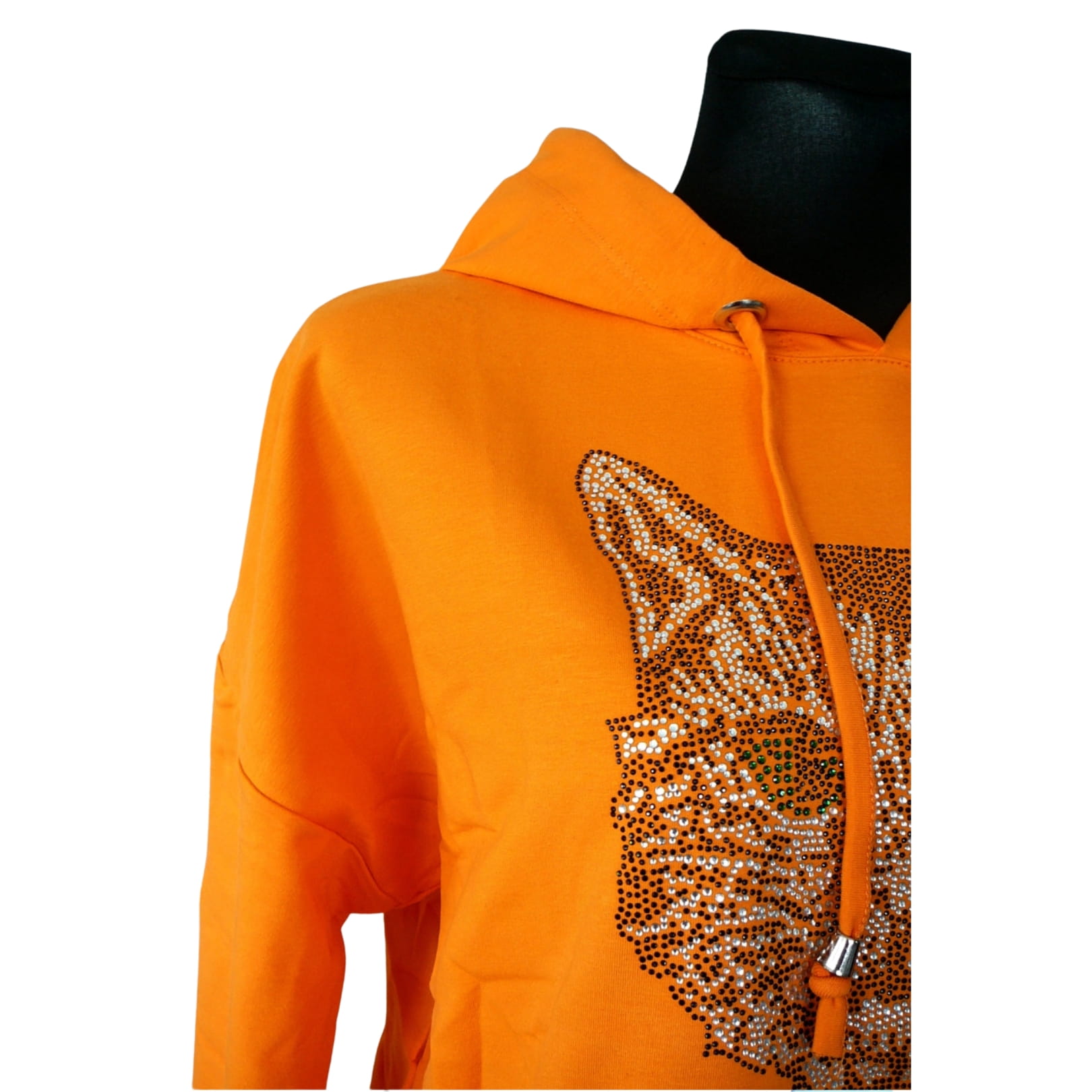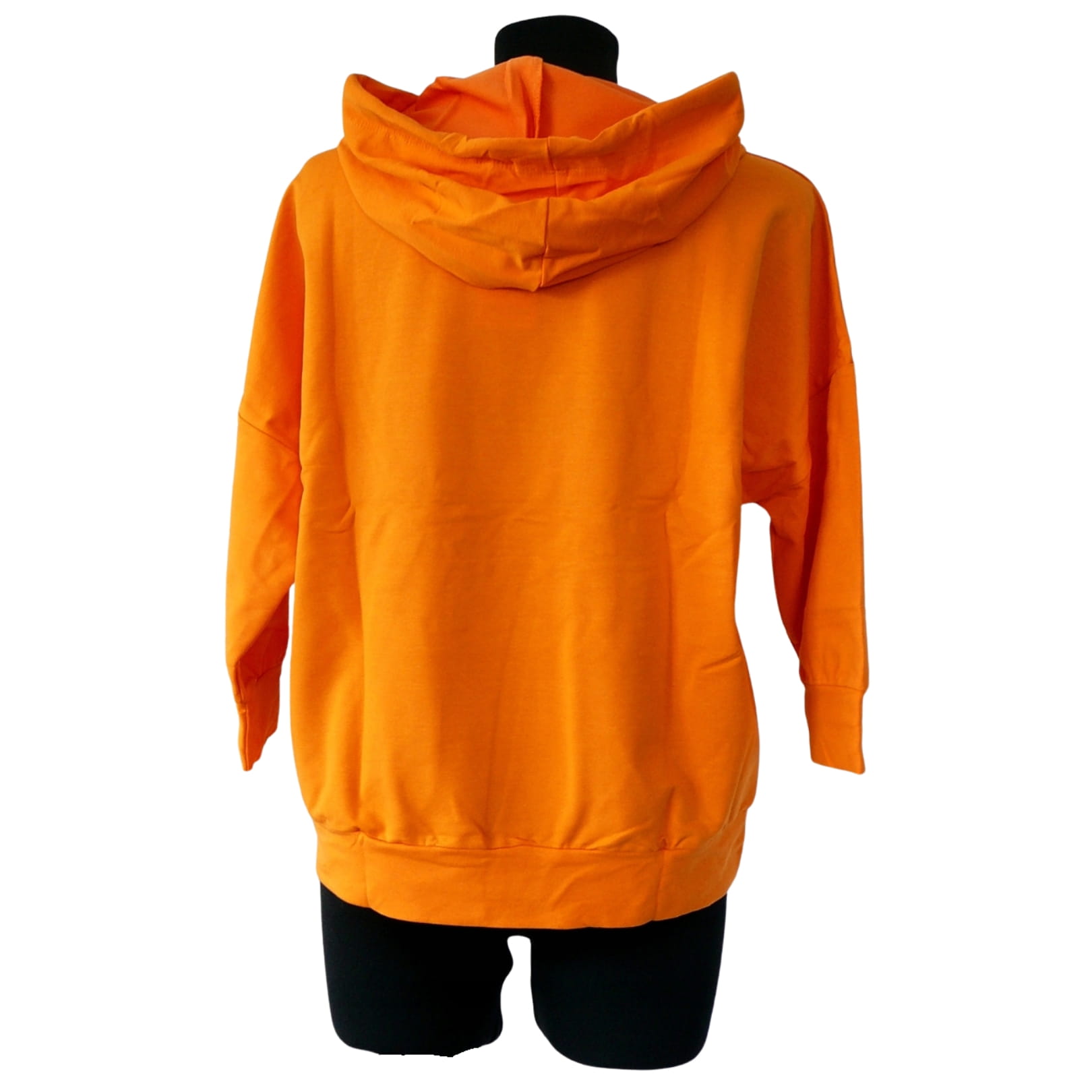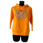 Pomarańczowa damska bluza typu kangur, z kapturem, rękawem 7/8 i srebrną połyskującą aplikacją z kotem - r. uniwersalny