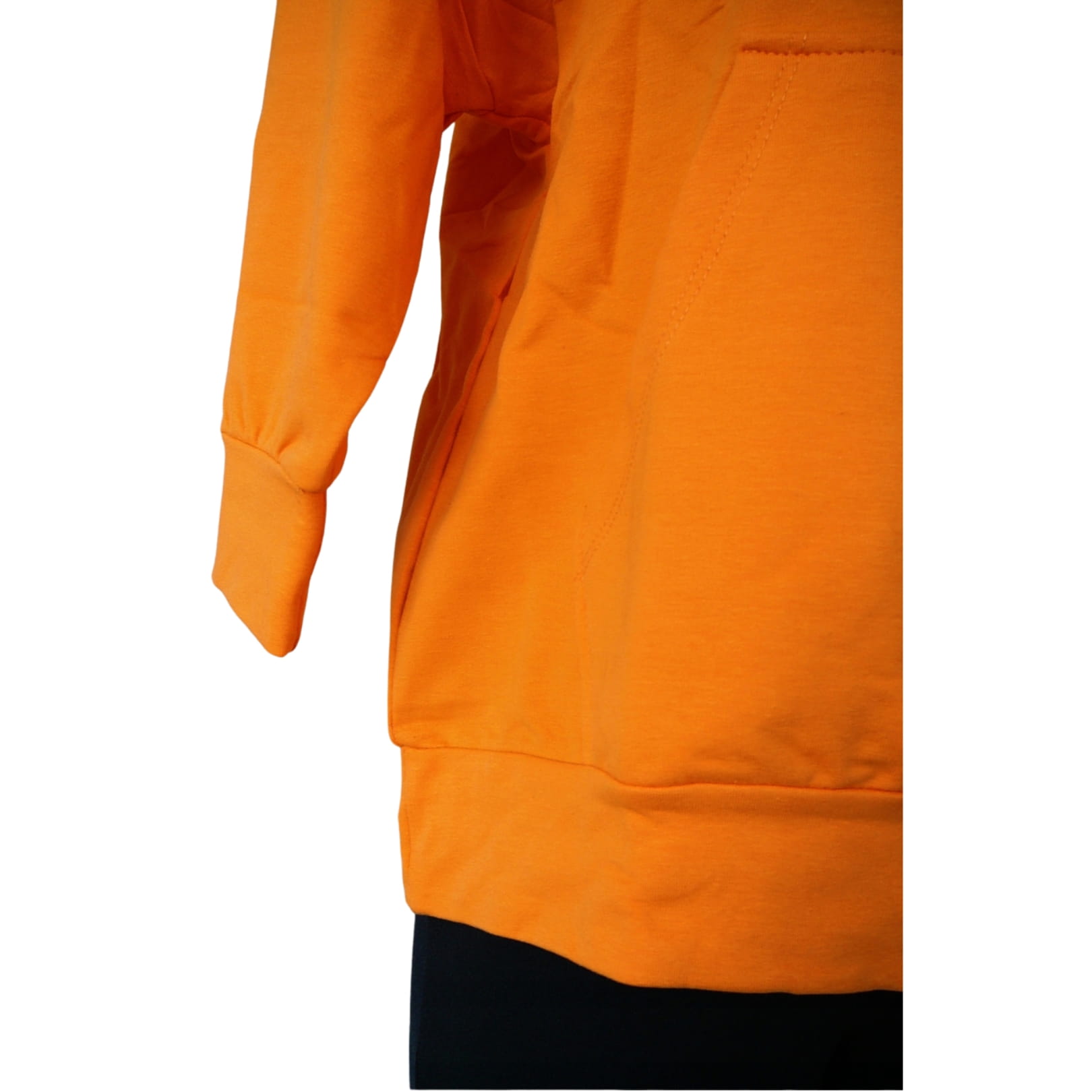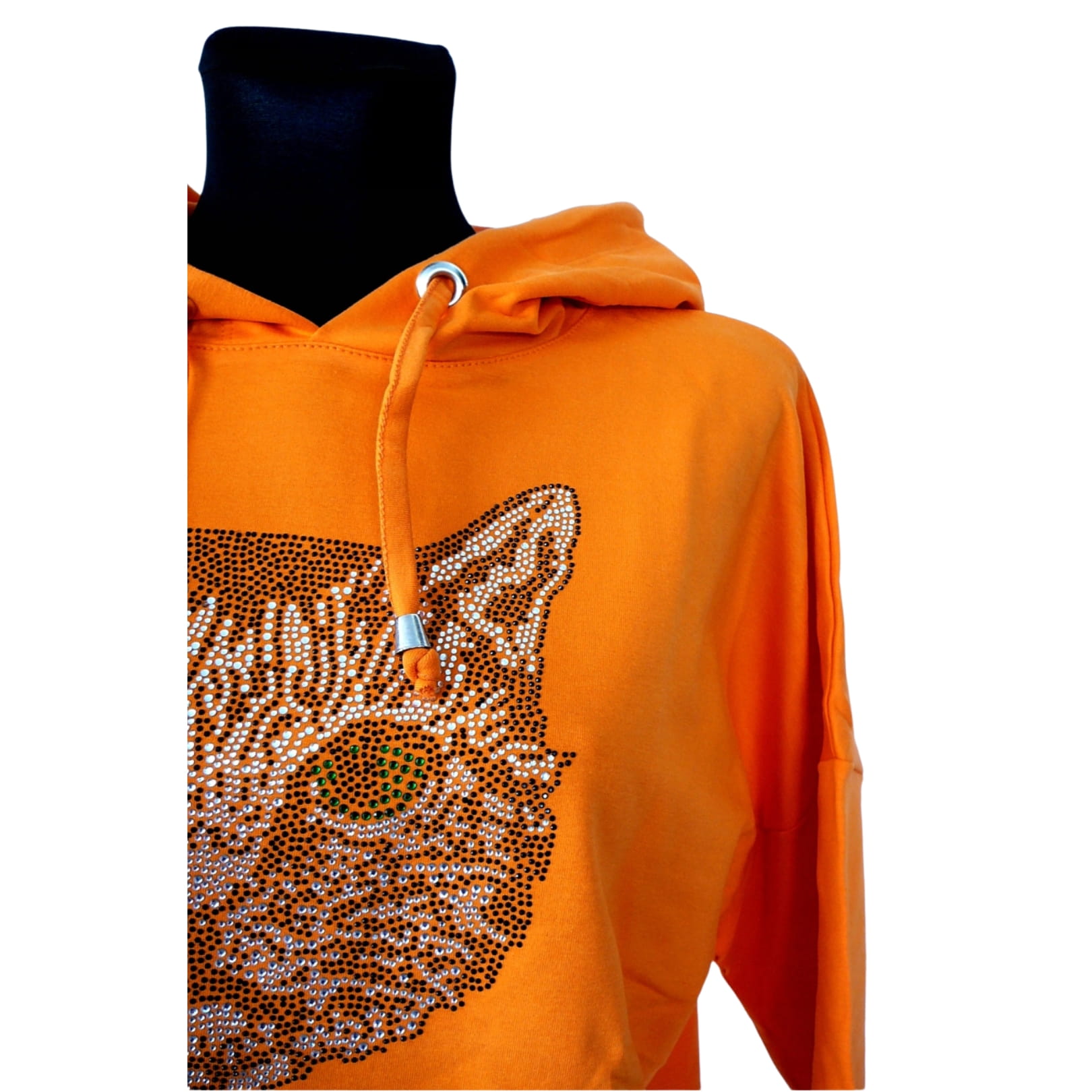 Pomarańczowa bluza z kapturem, kieszenią typu "kangur" i połyskującą aplikacją z kotem - wyróżnij się z tłumu w kocim stylu!