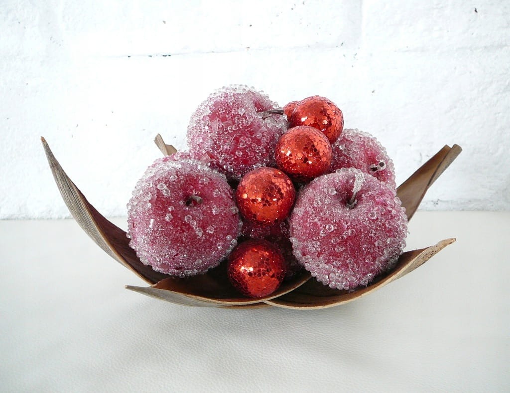 Świąteczna bożonarodzeniowa dekoracja z czerwonymi "oszronionymi" jabłkami i czerwonymi, błyszczącymi bombkami - unikatowe, polskie rękodzieło