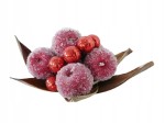Świąteczna dekoracja z czerwonymi "oszronionymi" jabłkami i czerwonymi, błyszczącymi bombkami