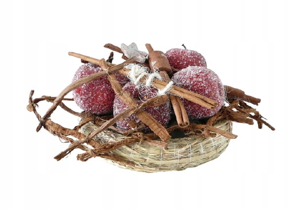 Świąteczna dekoracja z "oszronionymi" bordowymi jabłkami, cynamonem i gwiazdkami