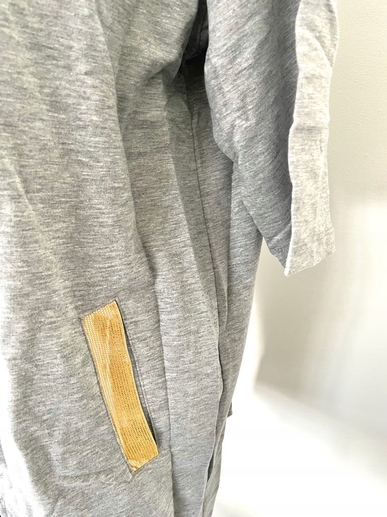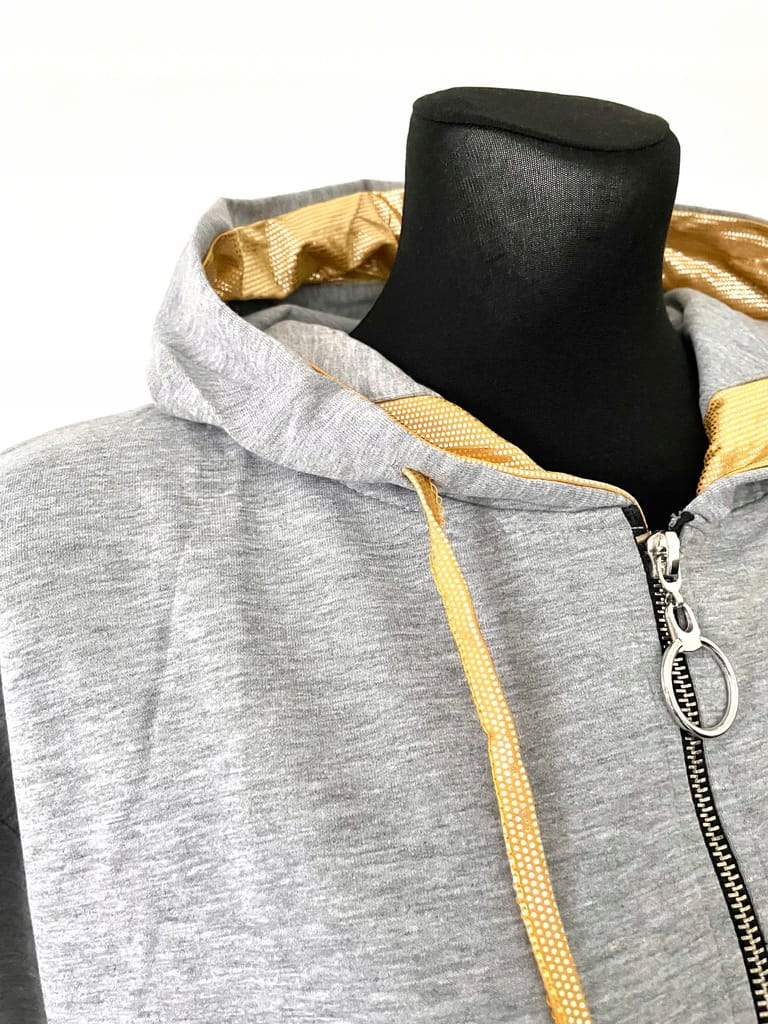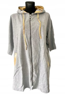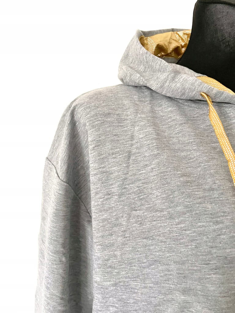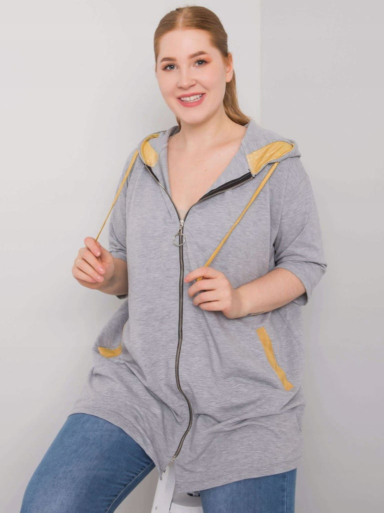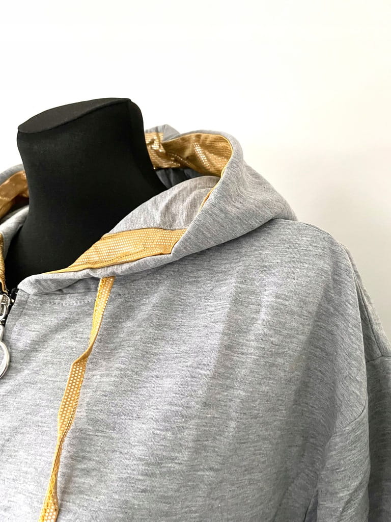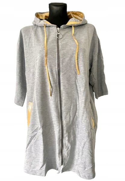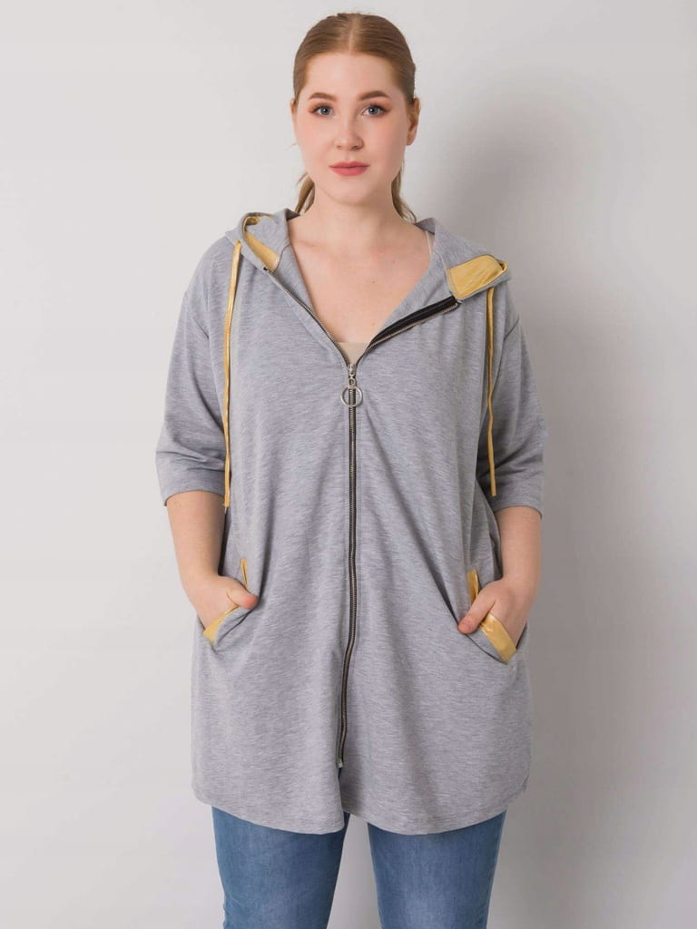 Luźna rozpinana jasnoszara bluza oversize/ plus size z kapturem i ozdobnymi żółto-złotymi wstawkami