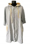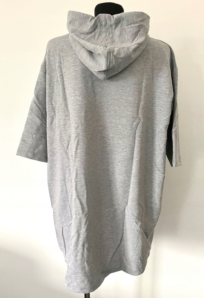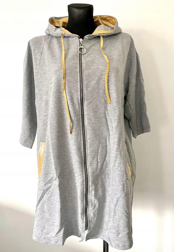 Szara rozpinana damska bluza oversize/ plus size z kapturem, kieszeniami, żółtymi wstawkami i rękawem 3/4 - r. uniwersalny