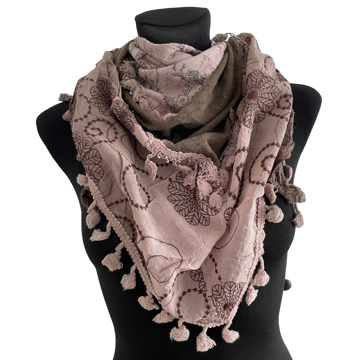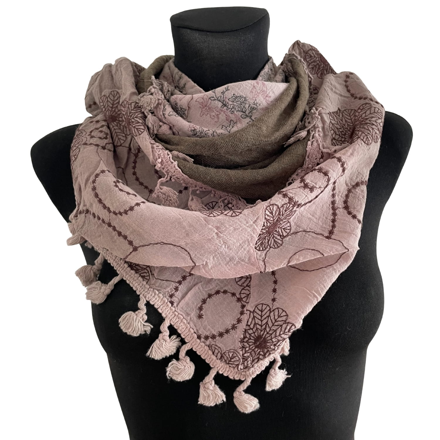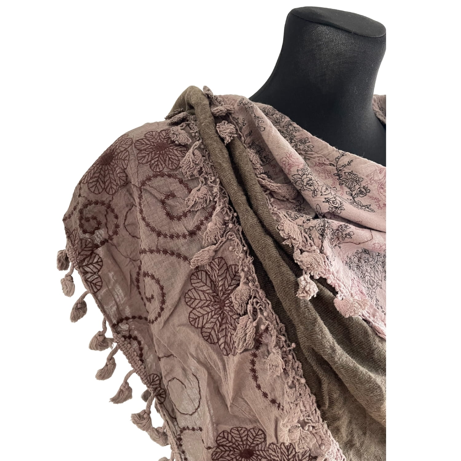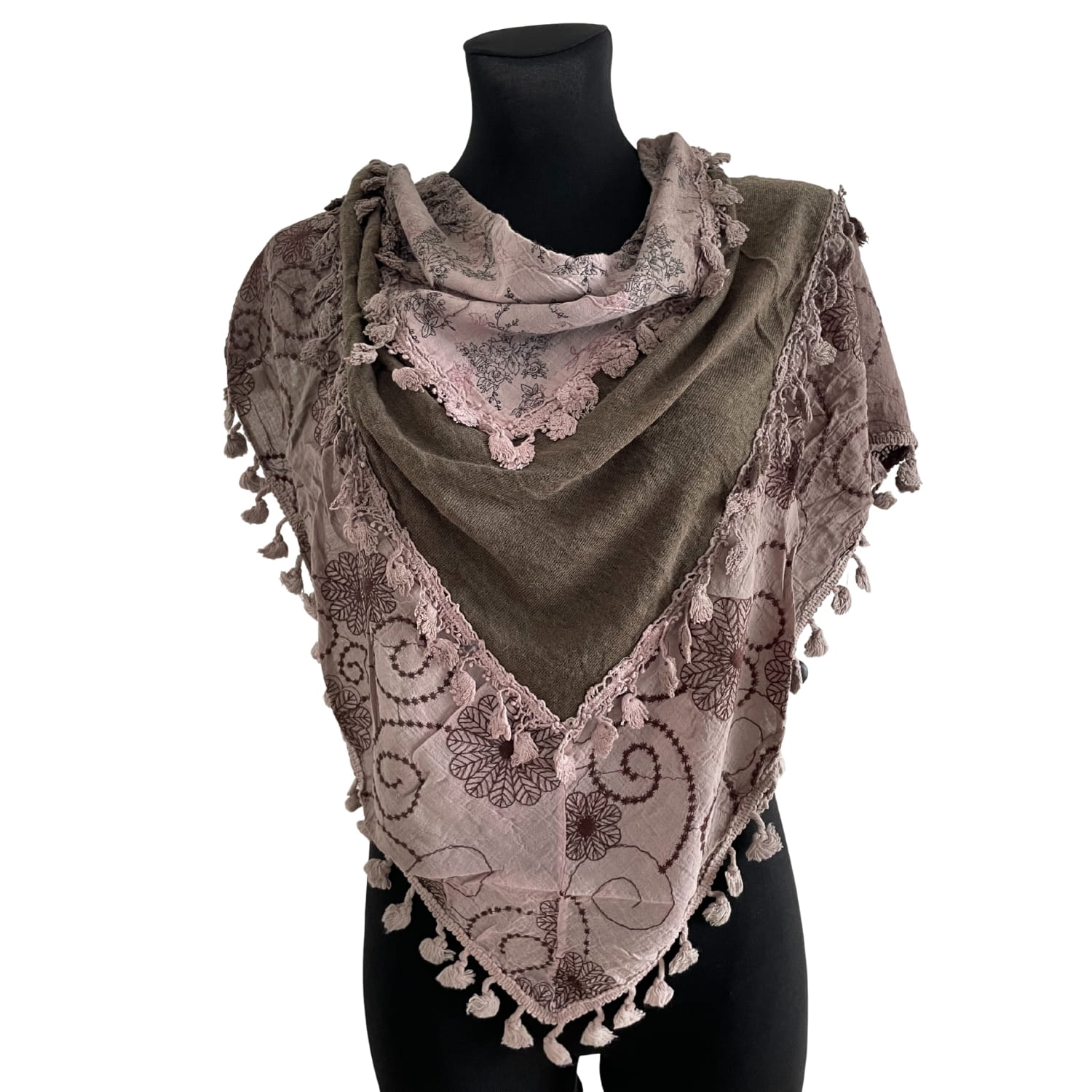 Trójkątna brązowo-khaki-różowa bawełniana damska chusta w haftowane kwiatowe wzory, z domieszką wełny, różne sploty i faktura materiału, z frędzlami - ok. 155 x 65 cm
