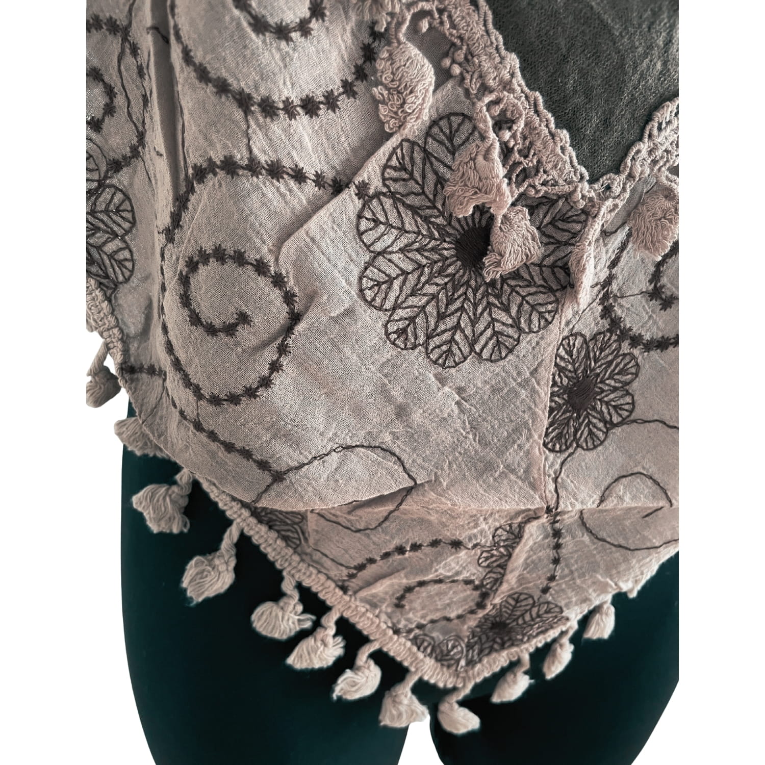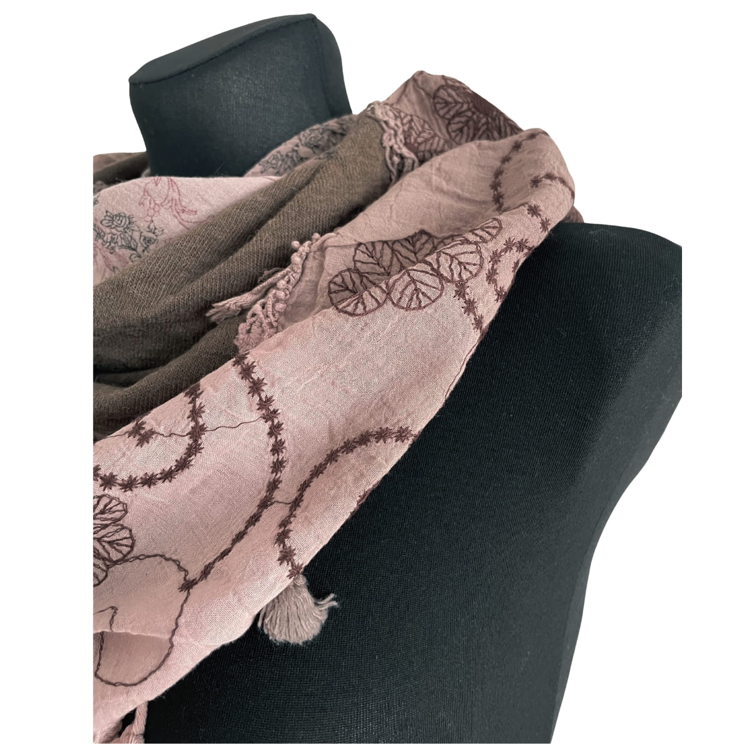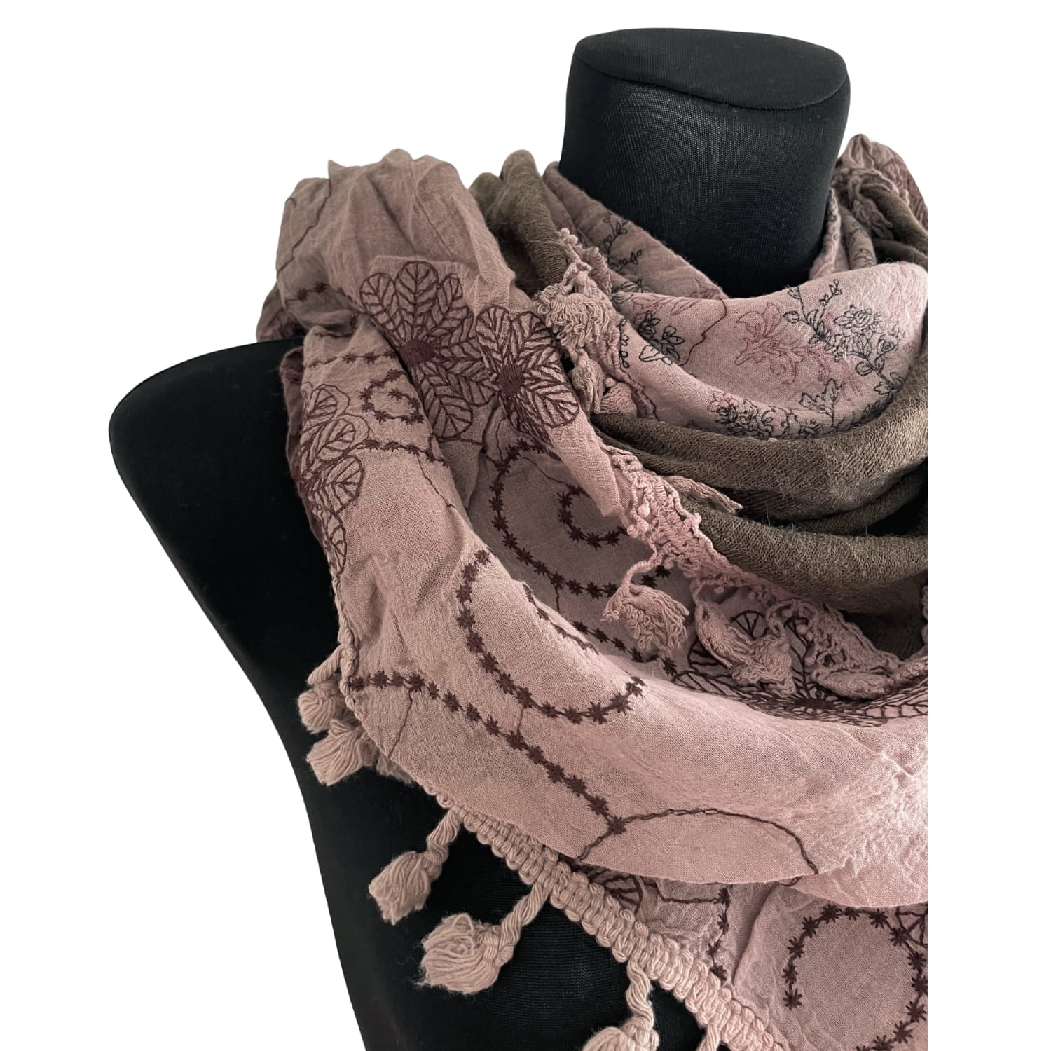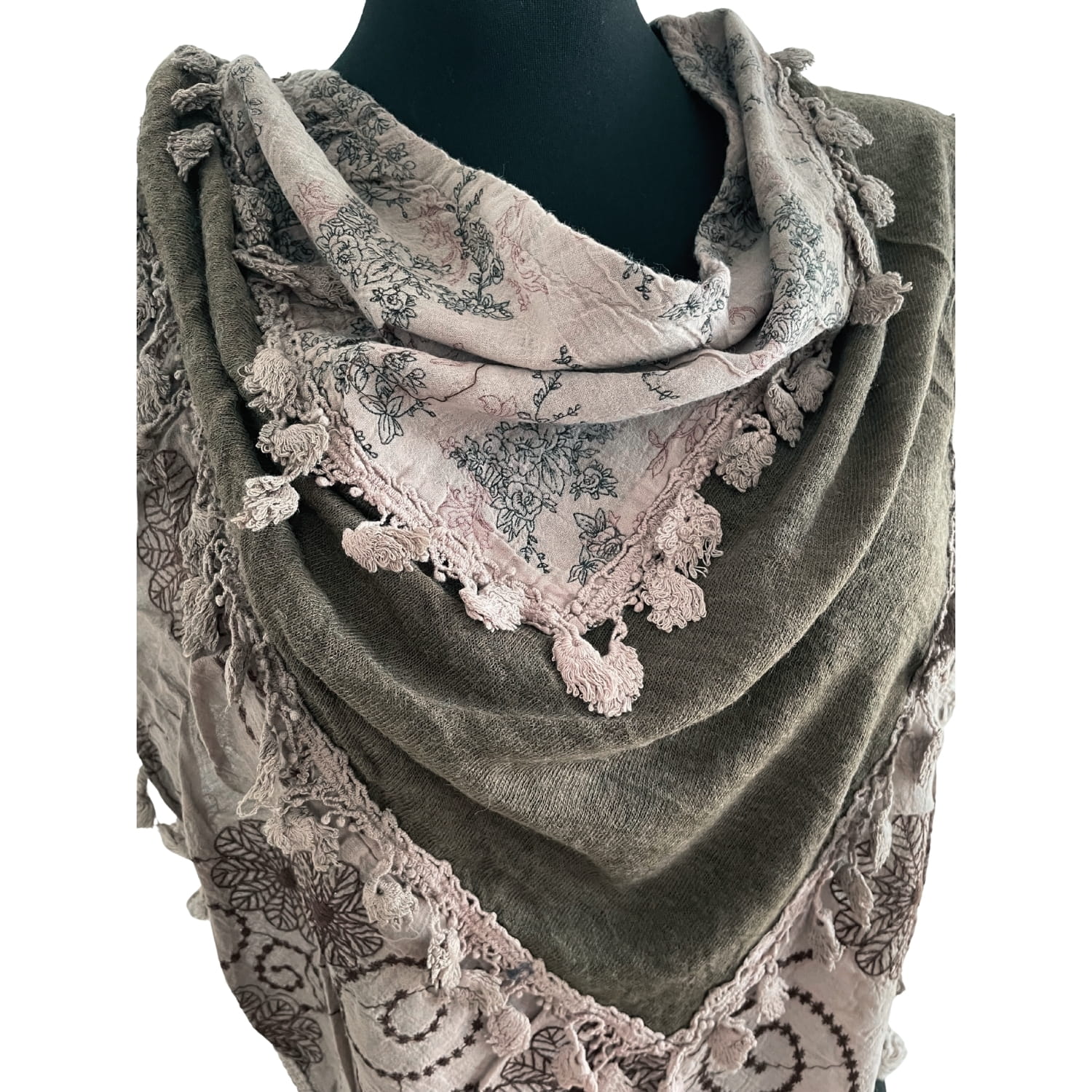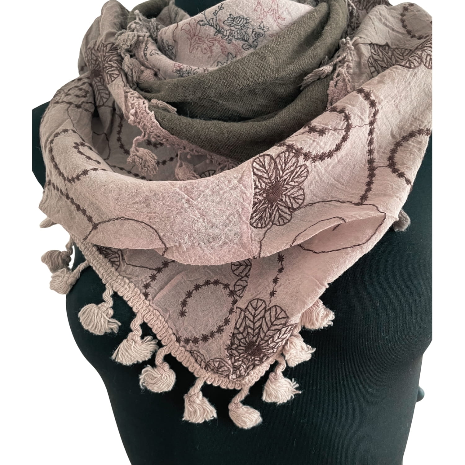 Trójkątna brązowo-khaki-różowa bawełniana damska chusta w haftowane kwiatowe wzory, z domieszką wełny, różne sploty i faktura materiału, z frędzlami - ok. 155 x 65 cm