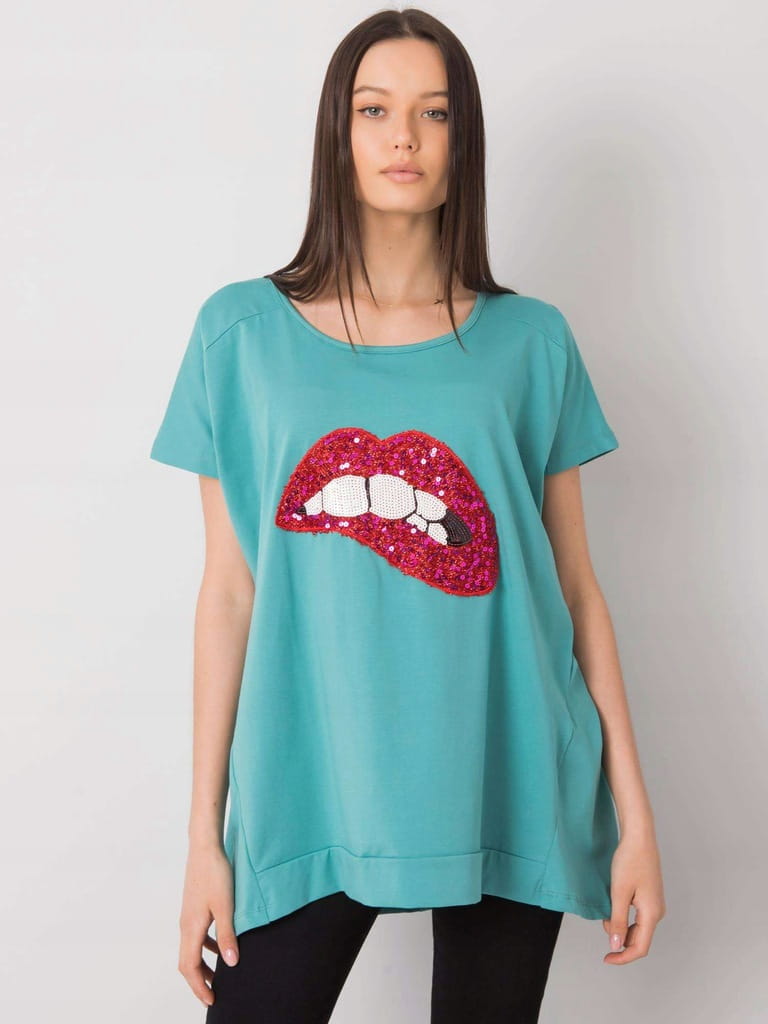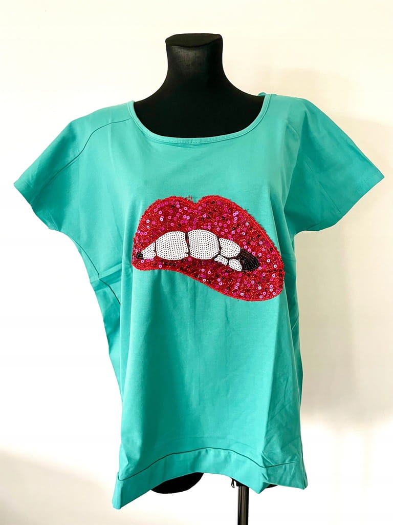 Turkusowa damska bluzka z cekinową aplikacją przygryzione wargi usta a la Rolling Stones, z krótkim rękawem - oversize, r. uniwersalny